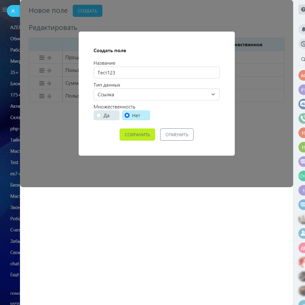 - Через приложение (левое меню) создайте поля с указанием типа и множественности