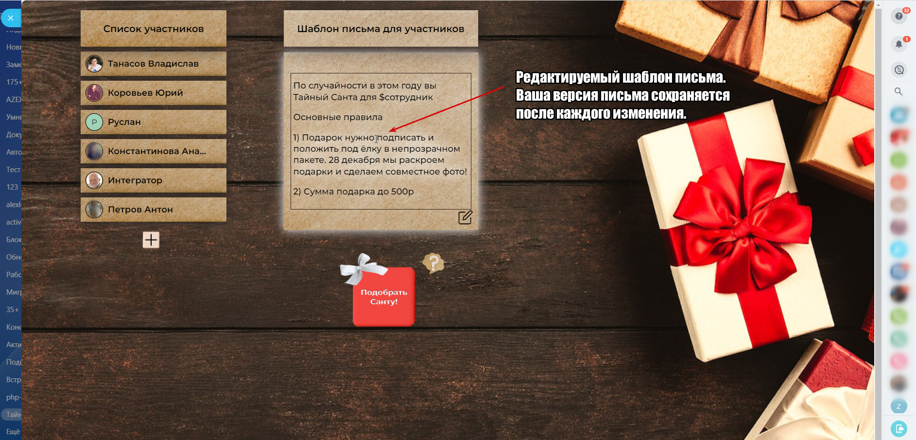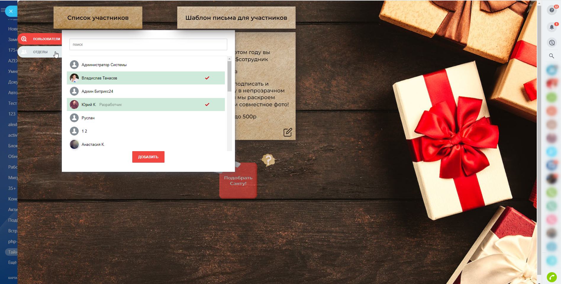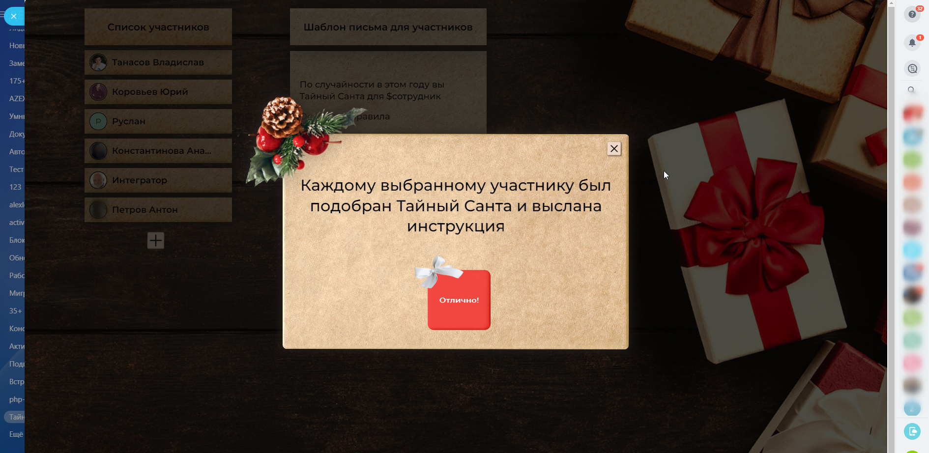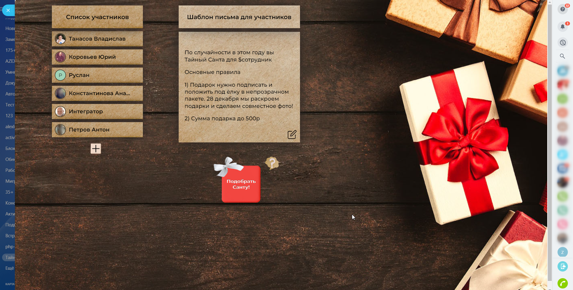 С наступающим Новым Годом! Поторопитесь, не оставьте без подарков никого! Тайный Санта для каждого выбранного сотрудника!