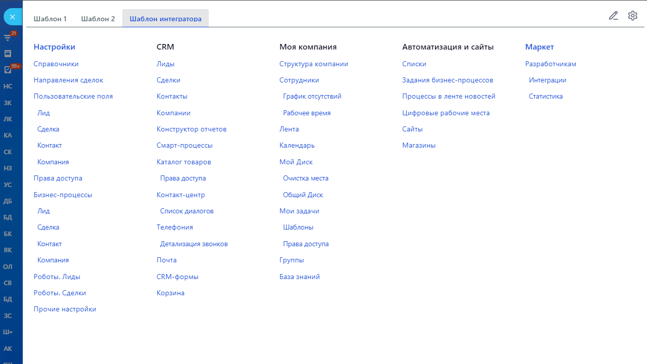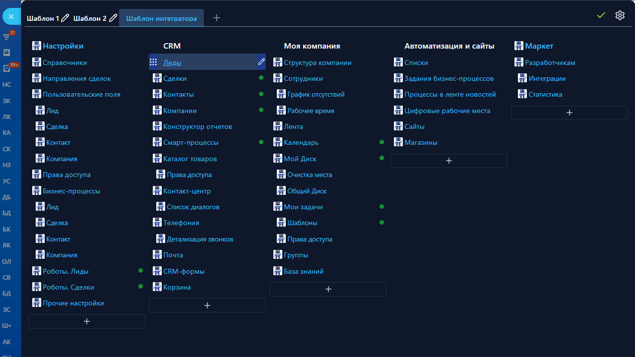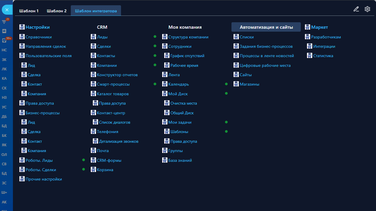 - Используйте предустановленный шаблон для быстрого доступа ко всем настройкам. Полезно администраторам и интеграторам;