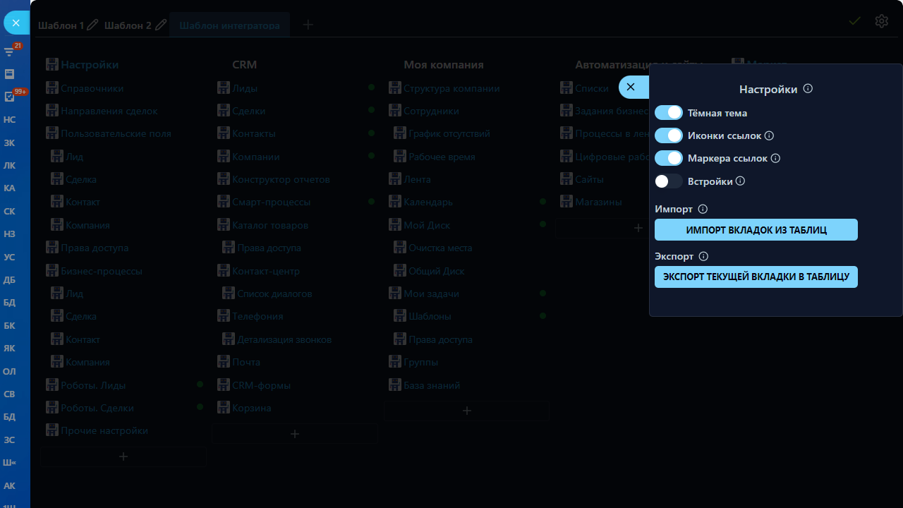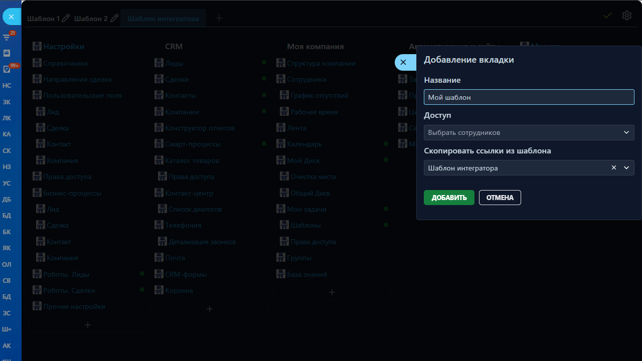 Администраторы могут настроить доступ к вкладкам "приватный" или "публичный", а также управлять видимостью шаблона интегратора;