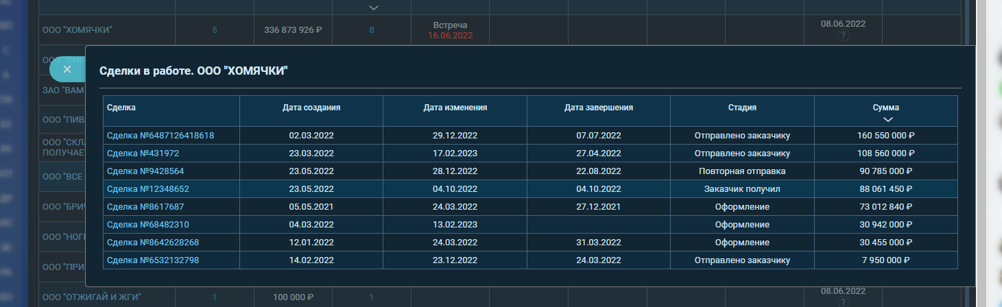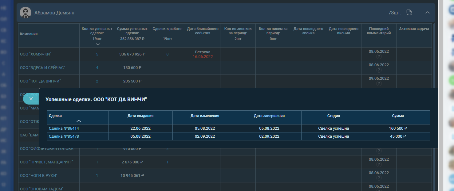 - Регулярная активность по компаниям (звонки, письма, задачи);