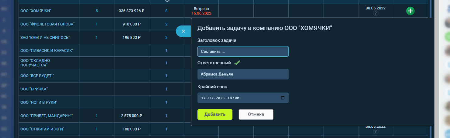 - Быстро ставьте задачу через "+", чтобы ответственный за компанию исправил ошибку или связался с клиентом.