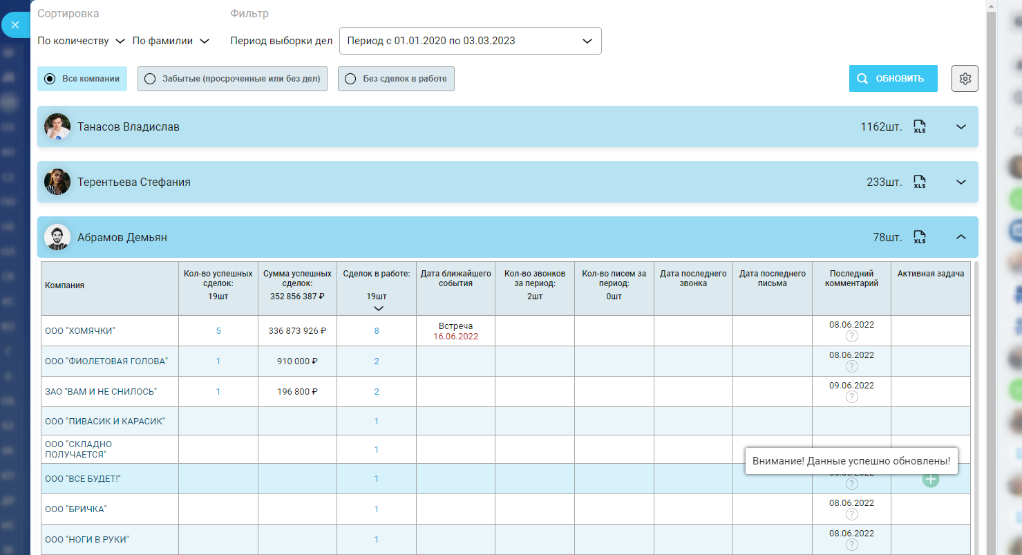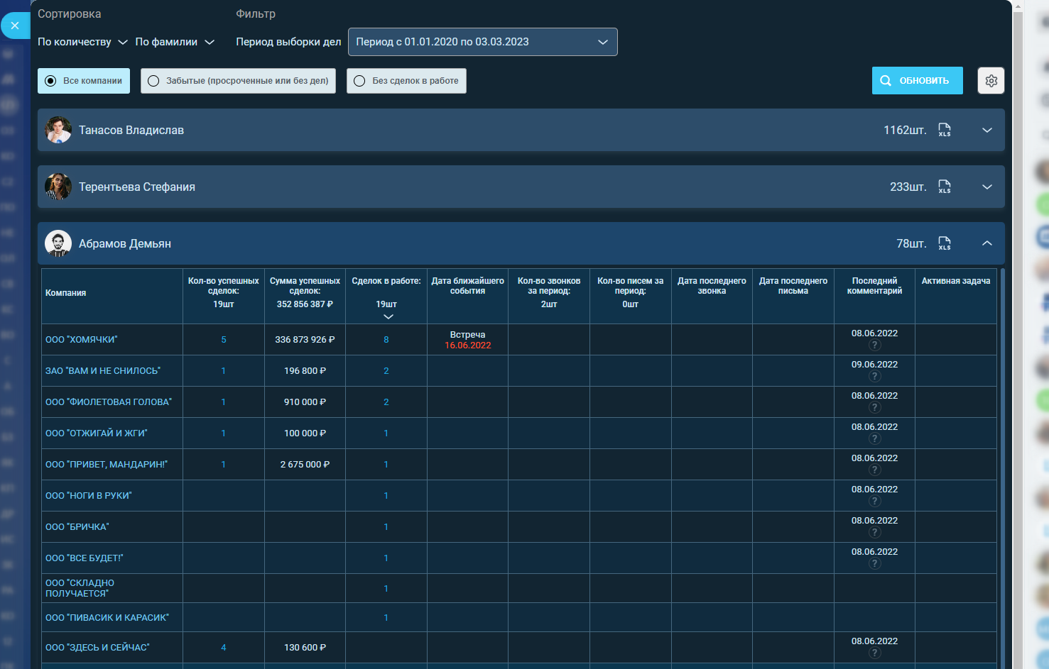 - Фильтр по периоду дел позволит ускорить поиск по компаниям. Нет дел за этот период - компания будет забытой;