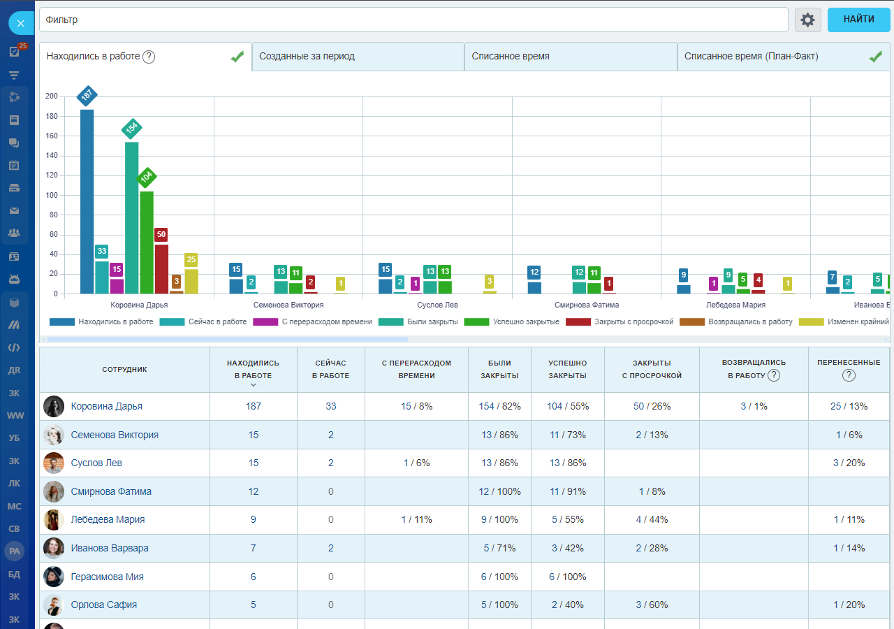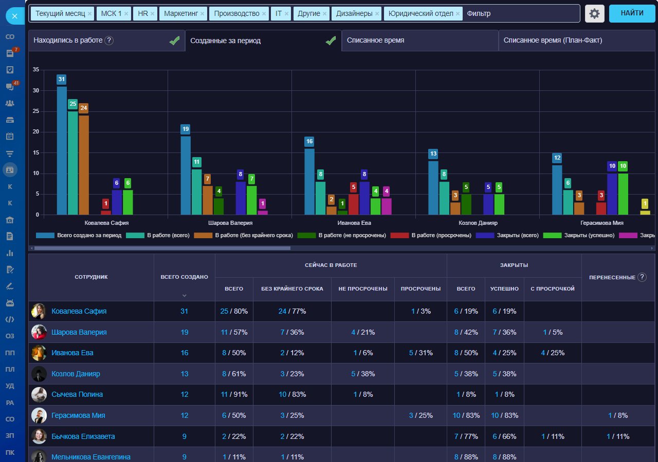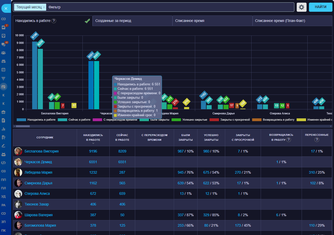• Сейчас в работе (всего, без крайнего срока, не просрочены, просрочены);