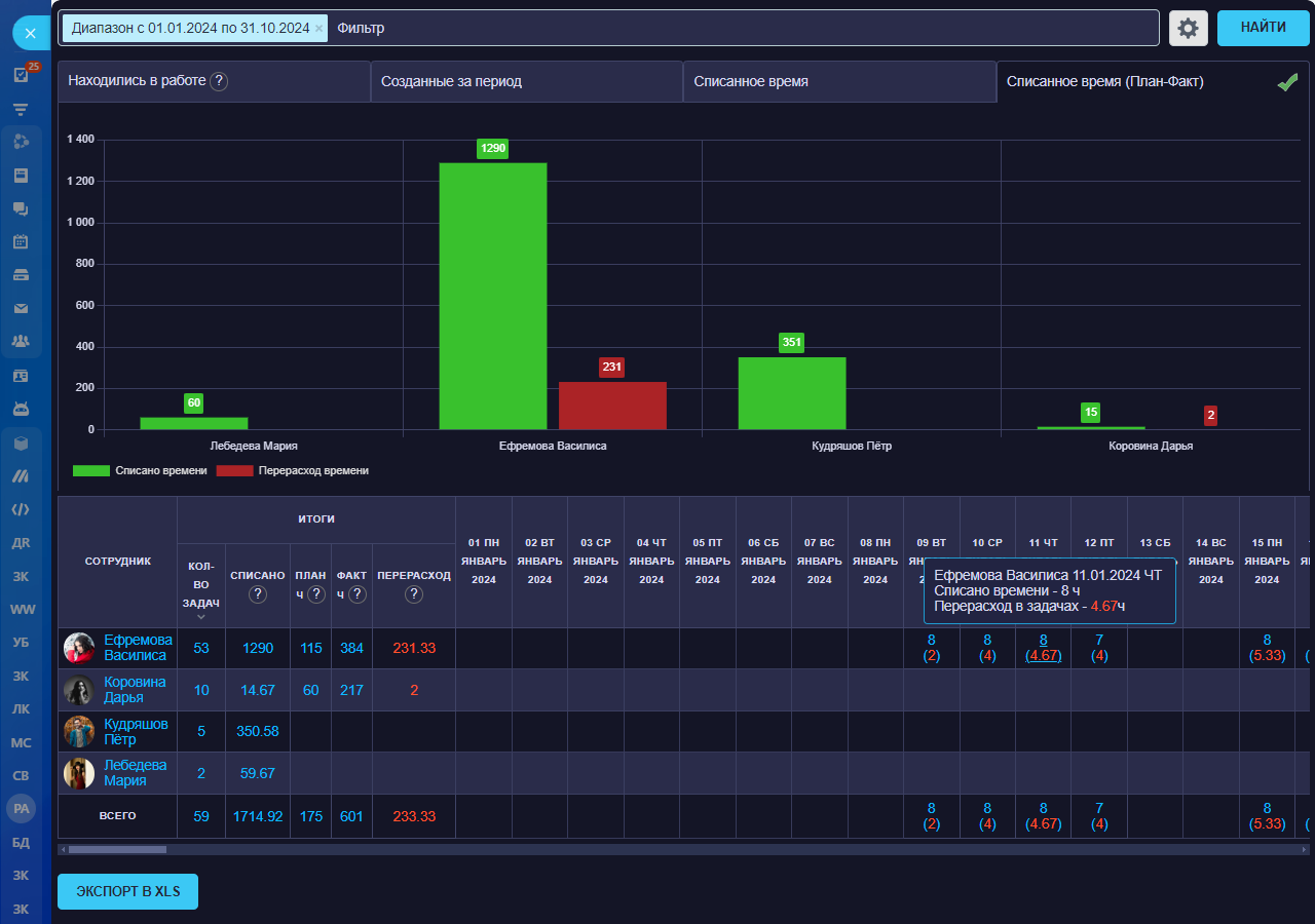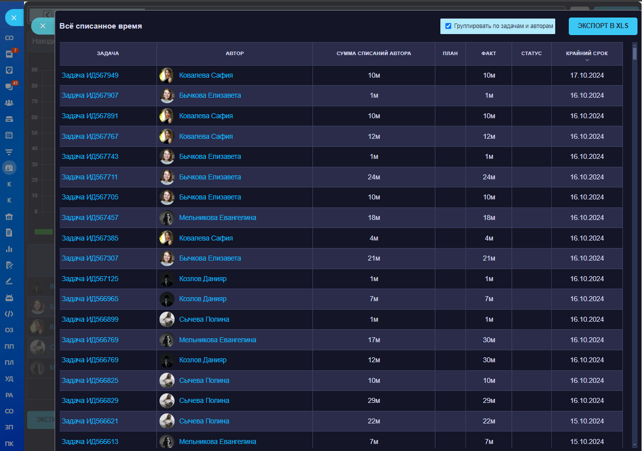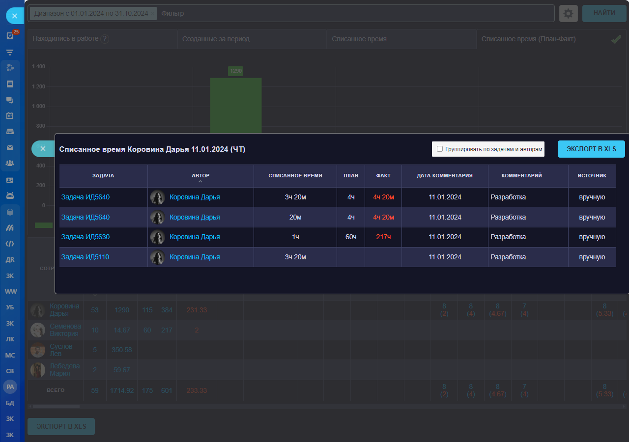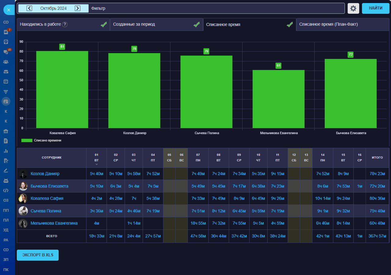 • Добавили вкладку "По списанному времени", чтобы видеть в пределах месяца списанное время сотрудниками.
