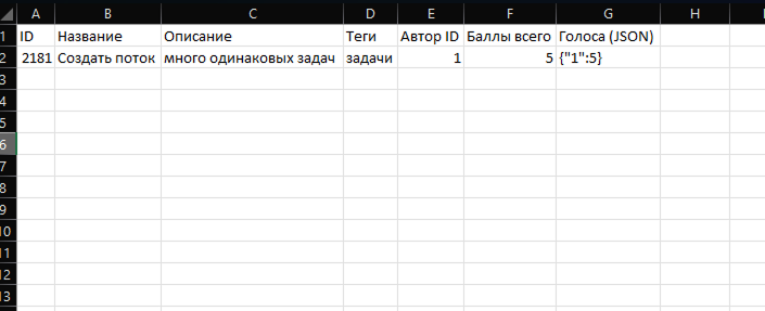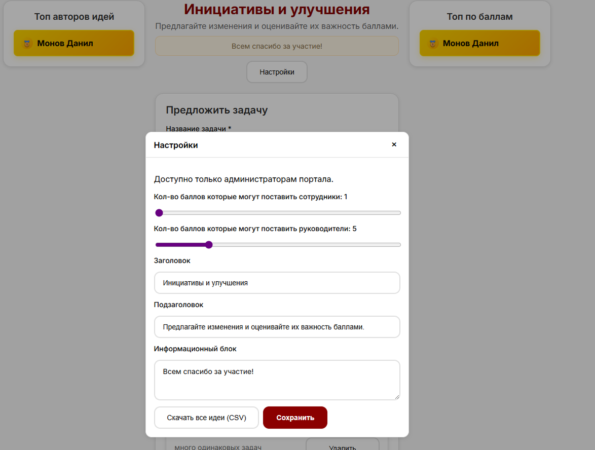 - Экспорт всех идей в CSV (ID, Название, Описание, Теги, Автор ID, Баллы всего, Голоса JSON).