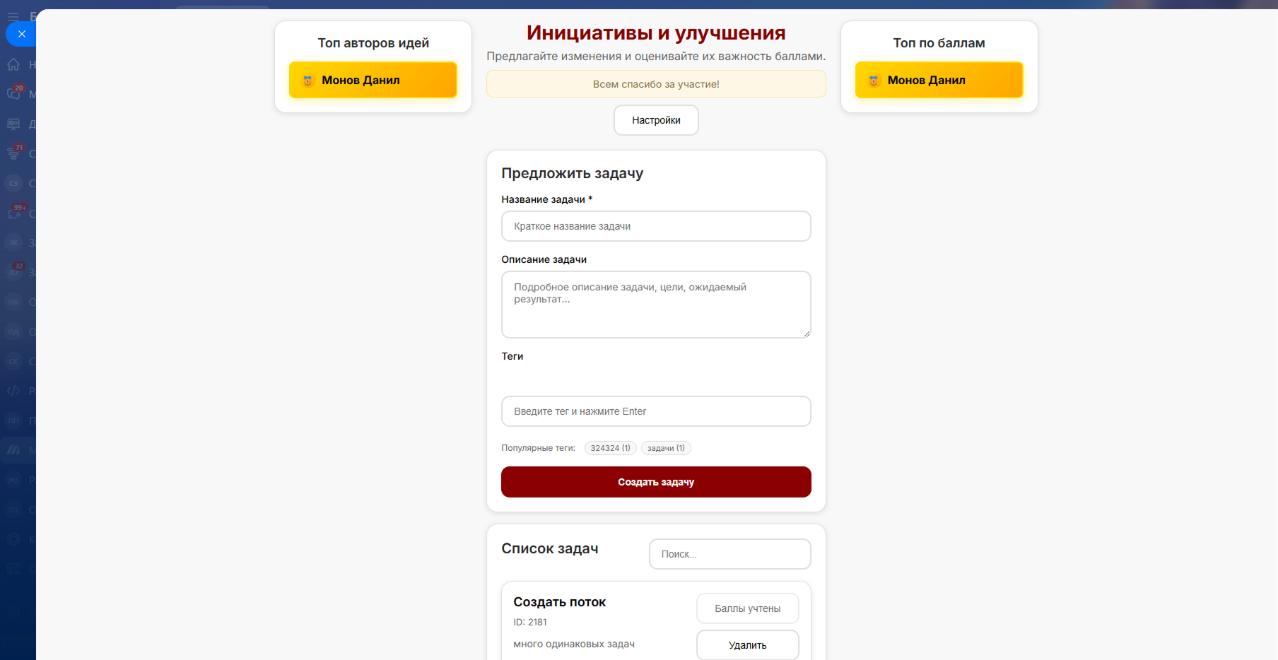 - Рейтинги авторов: по количеству идей и по сумме набранных баллов.