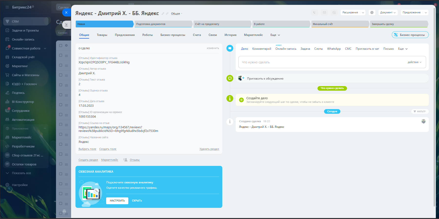 Это приложение кардинально упростило нашу работу с отзывами. Теперь все обращения из 2ГИС и Яндекс.Карт автоматически попадают в Битрикс24. Больше не нужно постоянно мониторить десяток площадок вручную.