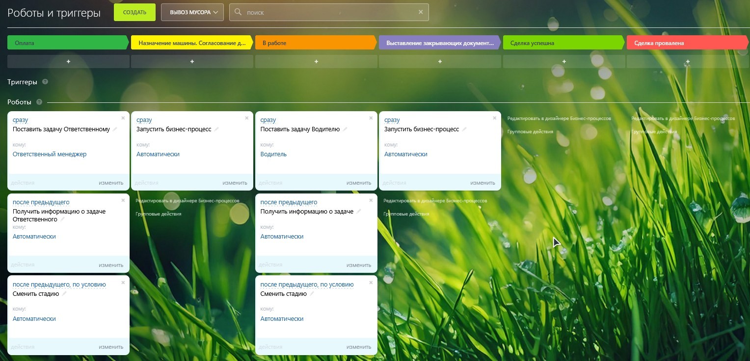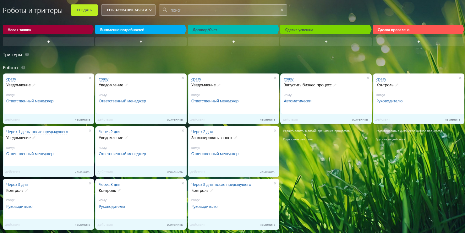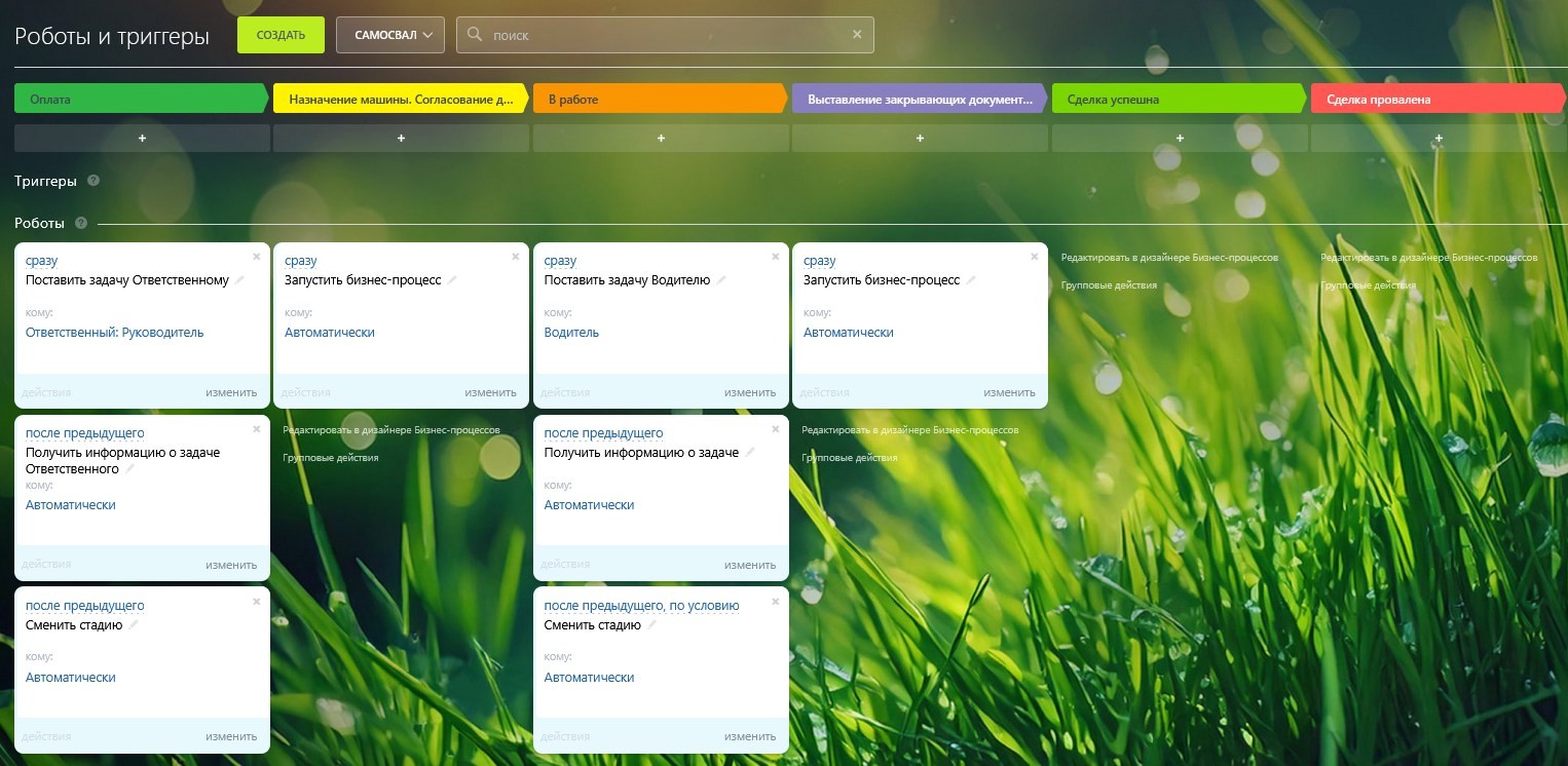 На этапах воронки в CRM настроены автоматические задачи. Они помогают менеджеру совершать необходимые действия для перехода сделки на следующий этап и напоминают о заполнении обязательных полей. Реализован автоматический переход по стадиям воронки.