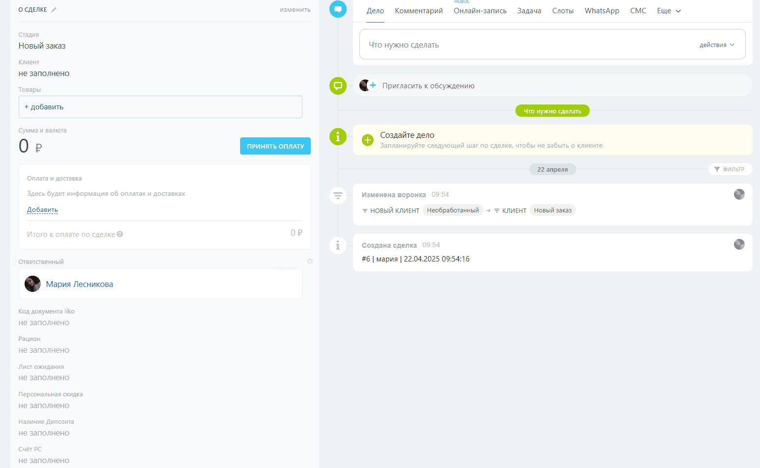- Создание новой сделки в назначенную дату повторного заказа
