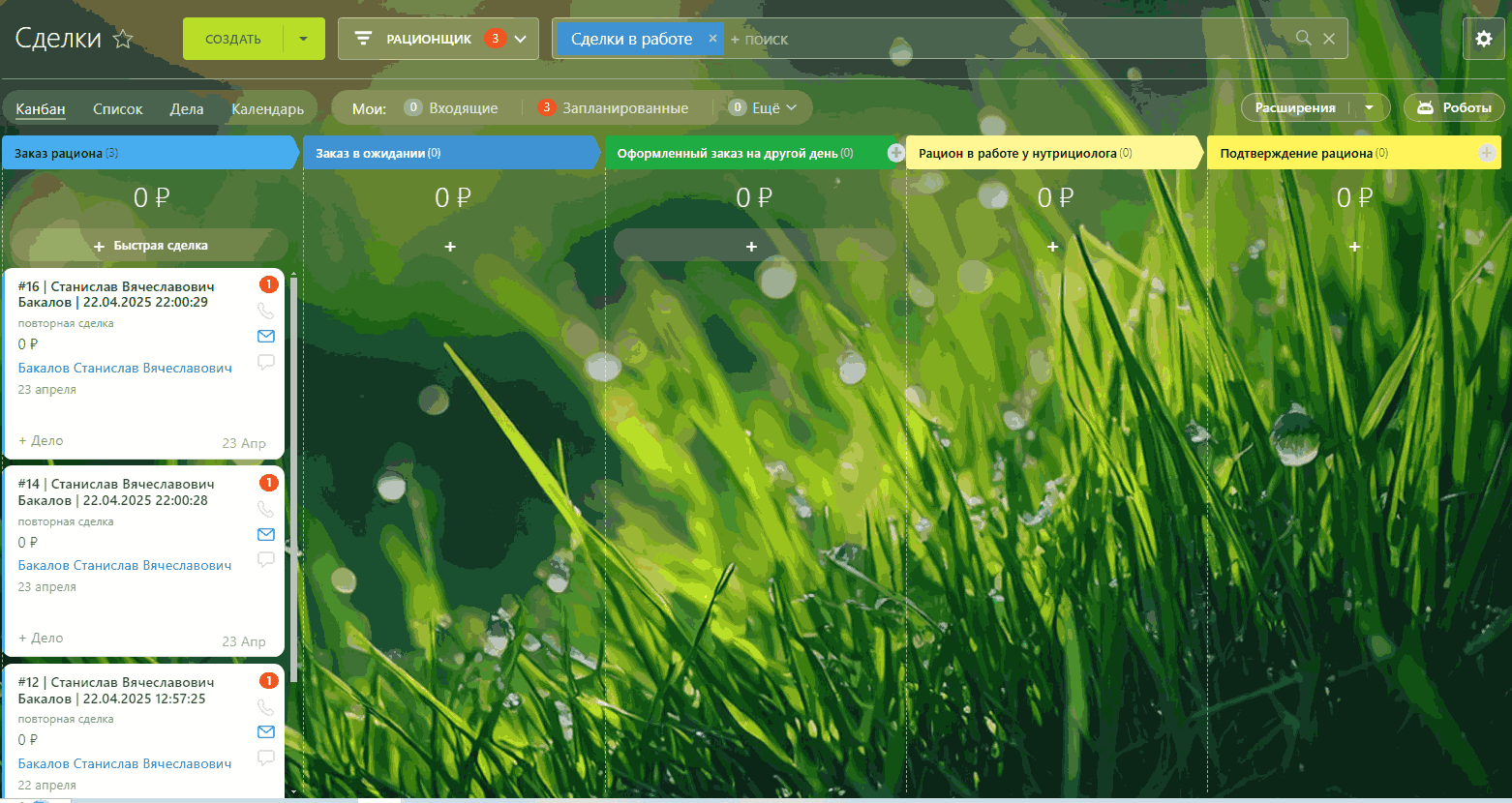 - Специализированная воронка для нутрициолога: Отдельный рабочий поток специально настроен для специалистов по питанию.