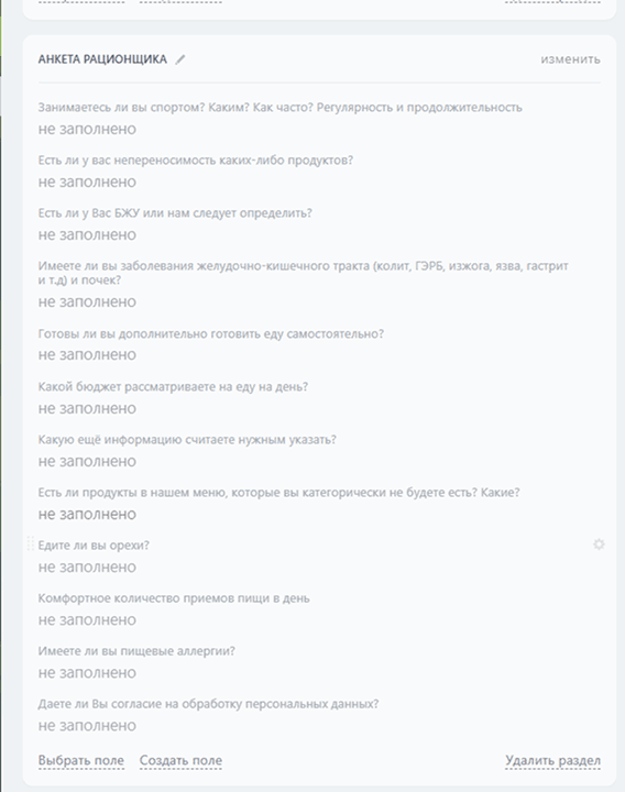 Карточка контакта содержит:- Вопросы для верного составления рациона