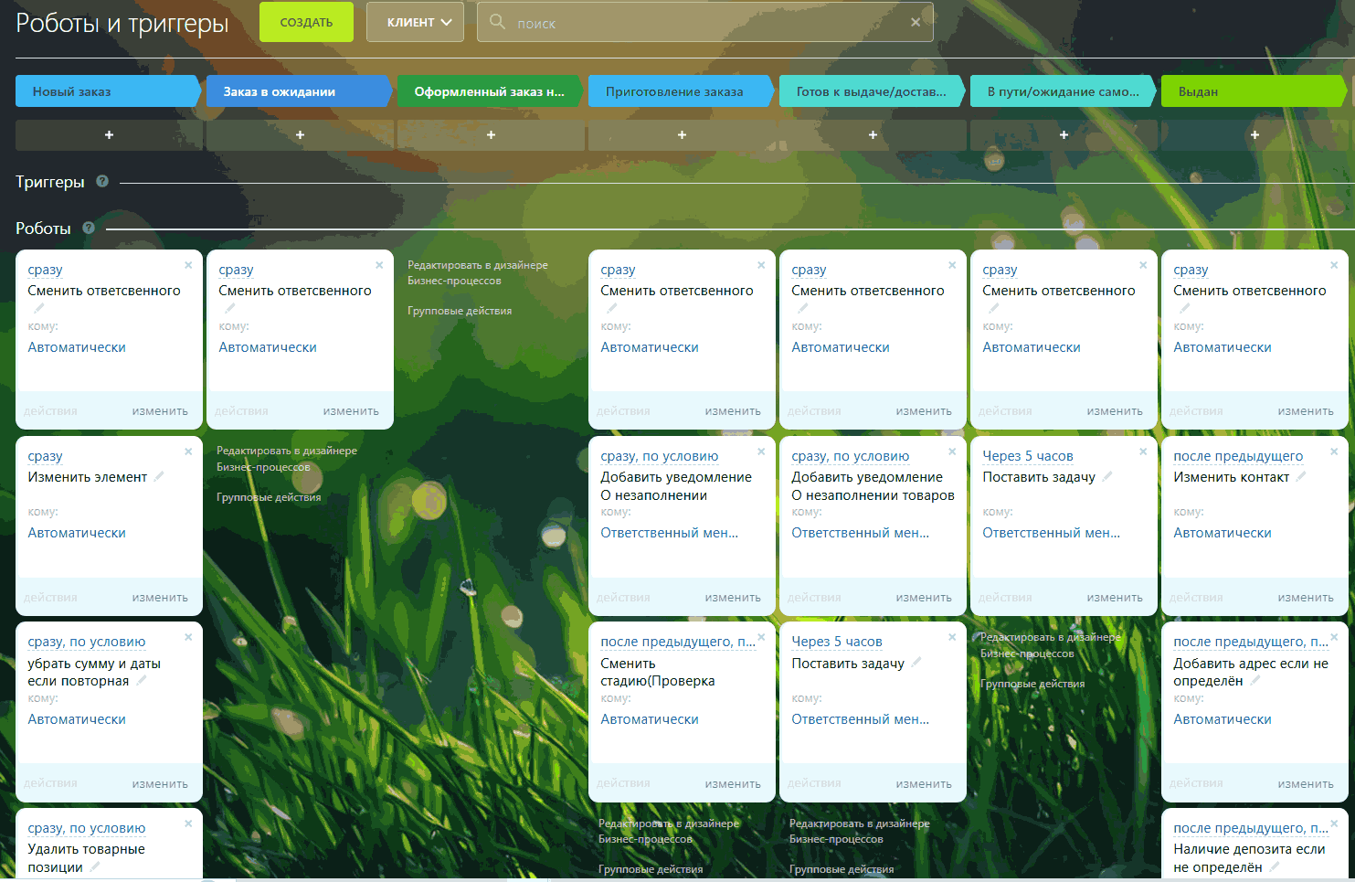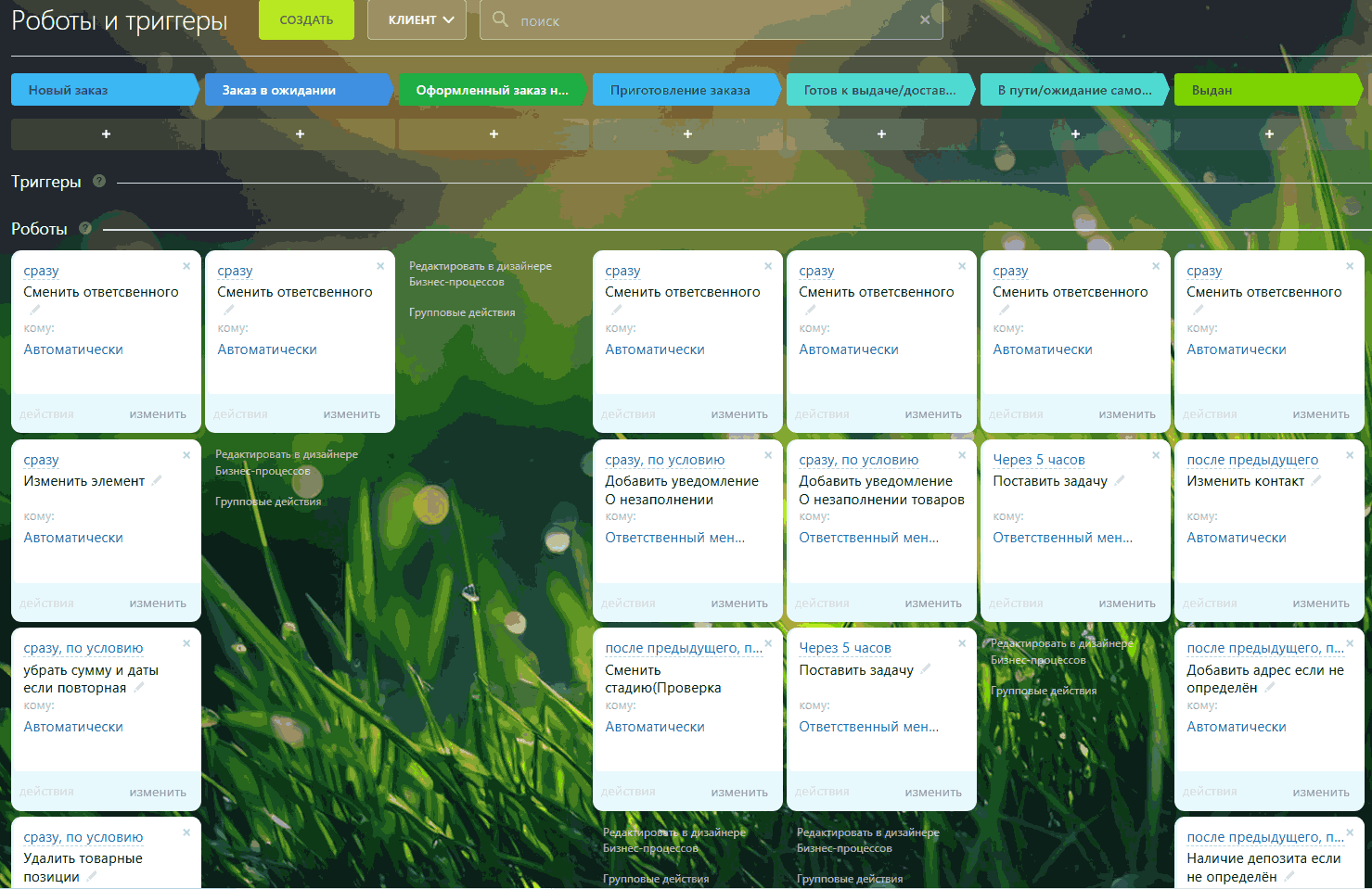 - Новый клиент — поступает первая информация о заказе, уточняются детали, заявка регистрируется и передается специалистам для последующей обработки