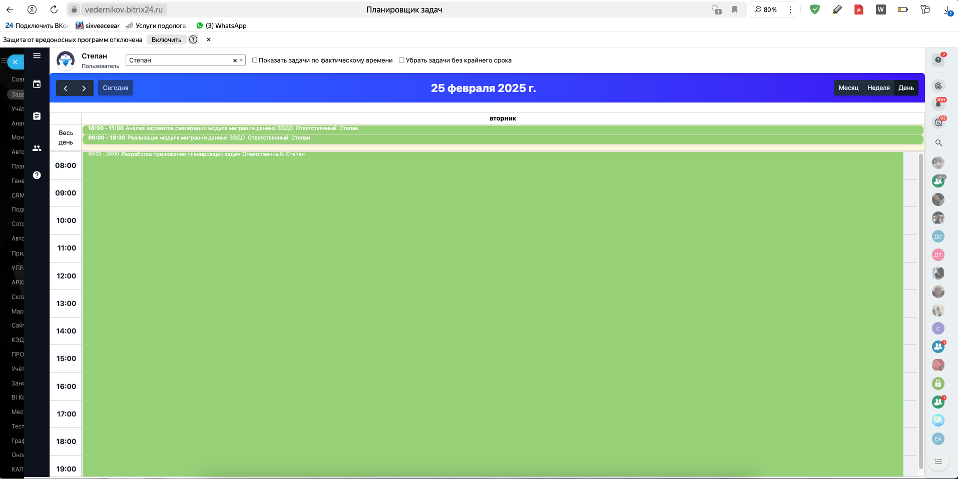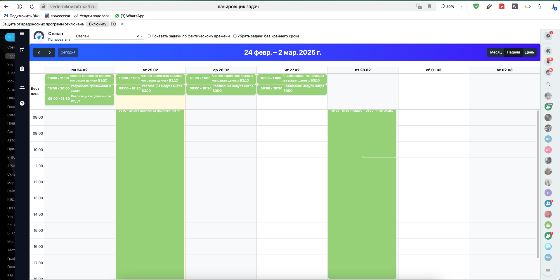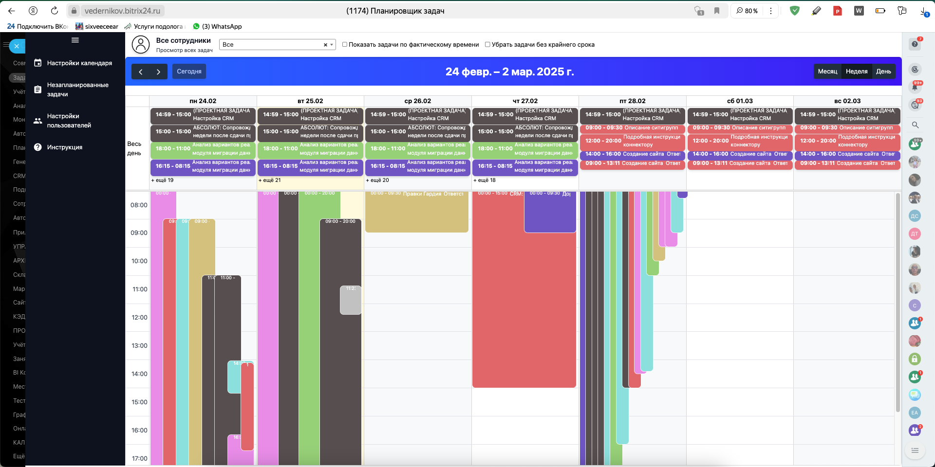 Какую проблему решаетВ стандартном виде задачи в Битрикс24 отображаются в списках, что делает их контроль неудобным: сложно увидеть нагрузку сотрудников, отследить сроки и быстро вносить изменения. В итоге часть задач уходит из поля зрения, дедлайны срываются, а менеджеры тратят время на поиск нужной информации.