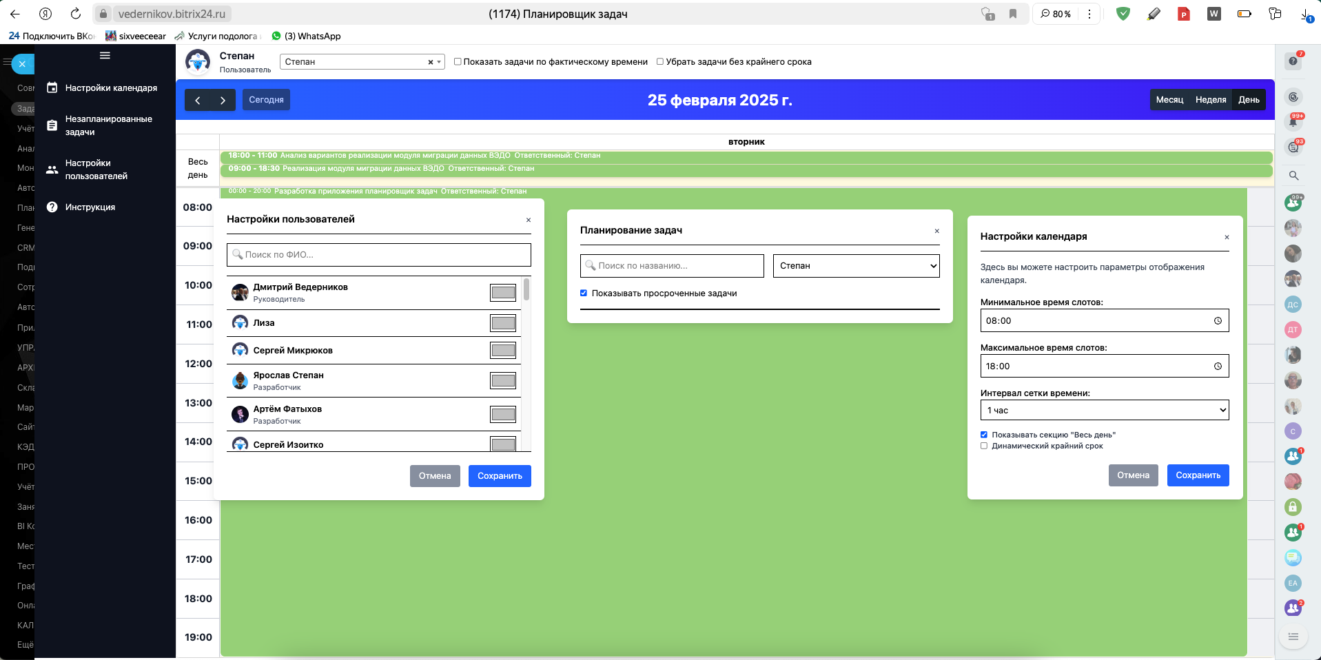 Планировщик задач – это удобный инструмент для управления задачами внутри Битрикс24 в формате интерактивного календаря. Приложение позволяет просматривать, создавать, редактировать и удалять задачи, фильтровать их по исполнителям и срокам, а также управлять сроками выполнения. Вся работа ведется в интуитивно понятном интерфейсе с интеграцией с Битрикс24.