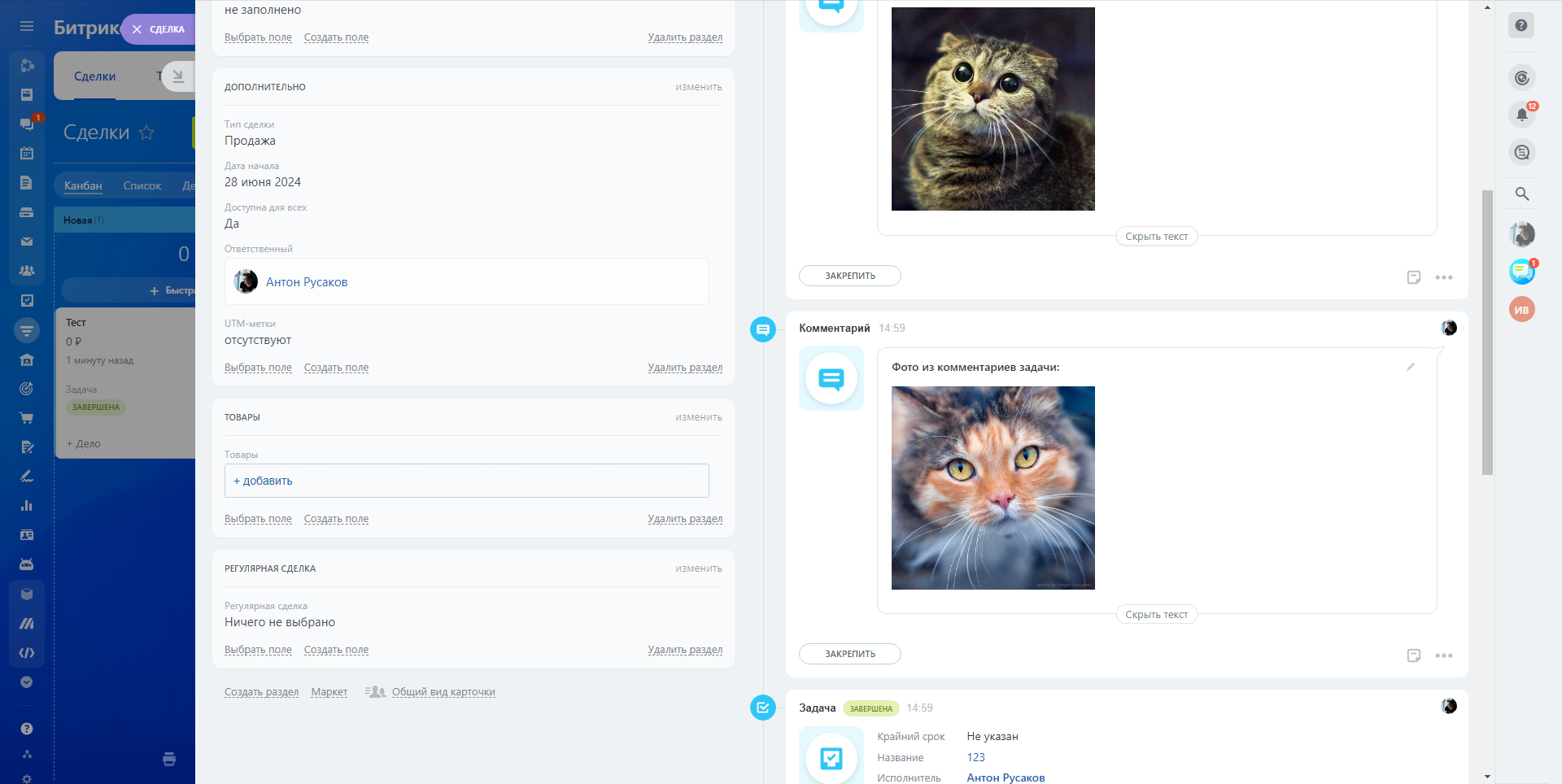 - Автоматическое добавление изображений из задач в комментарии сделок