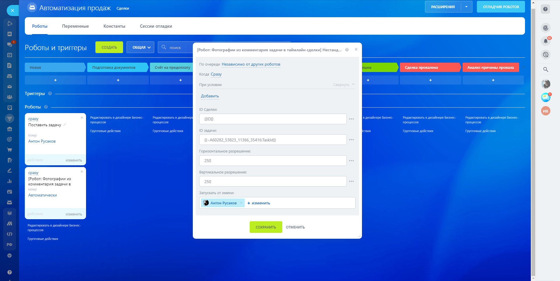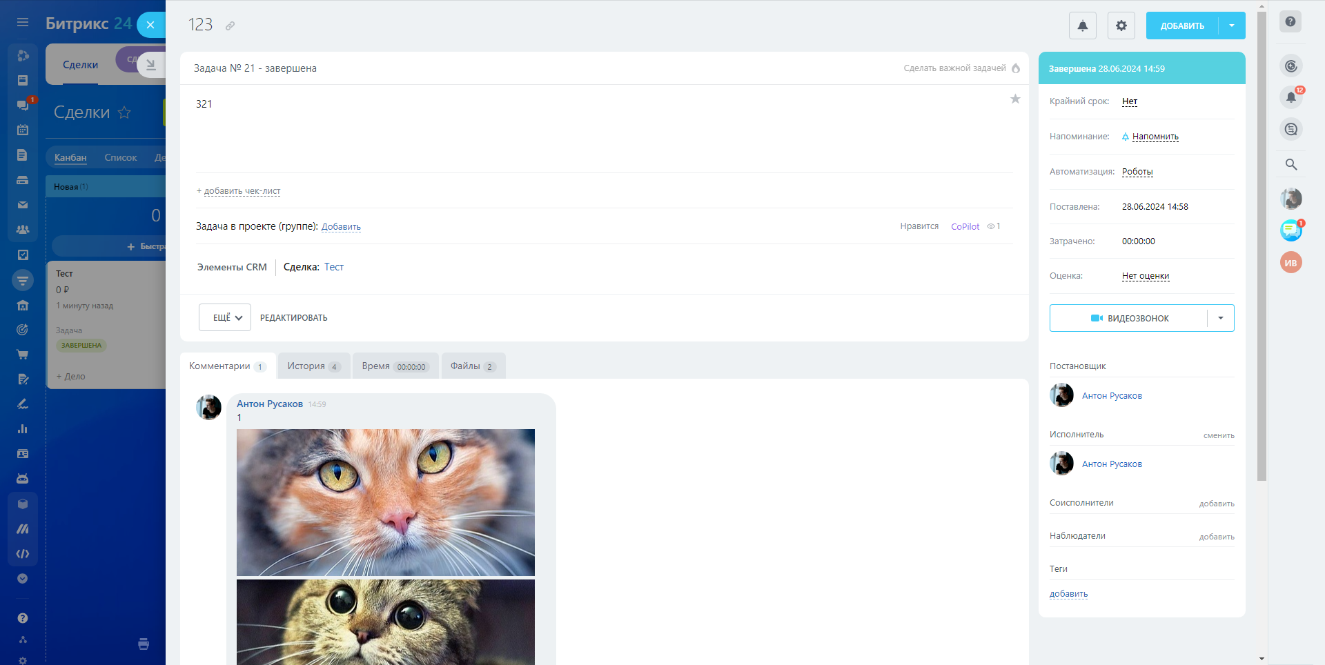 Робот решает эту проблему: все фотографии из задач автоматически оказываются в сделке, сохраняя целостность истории и упрощая доступ команде.