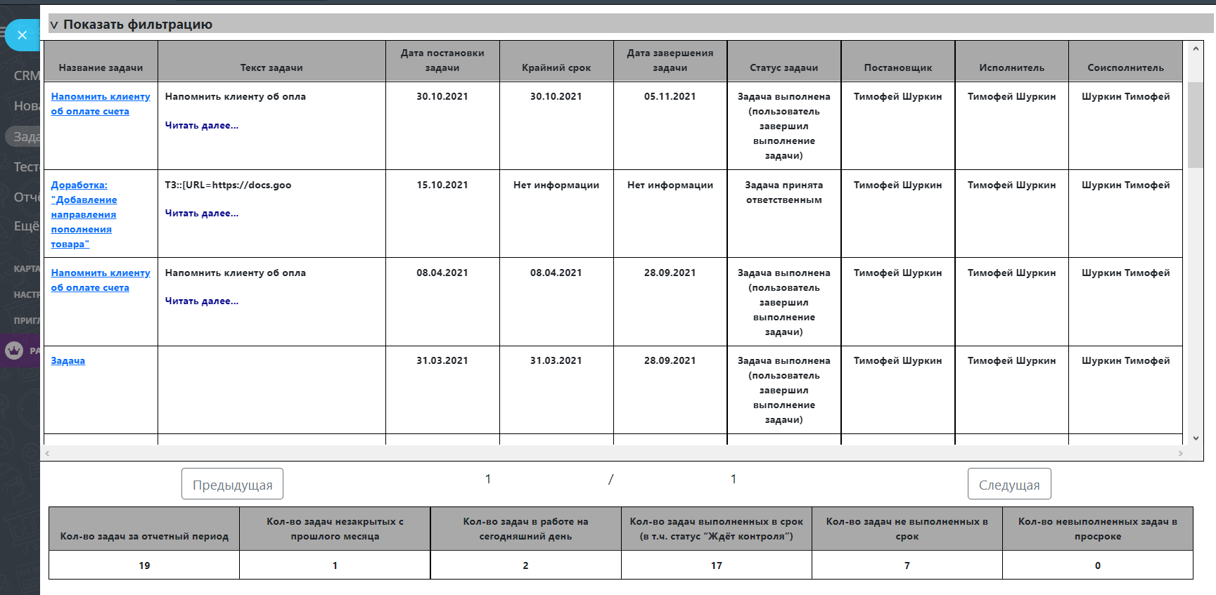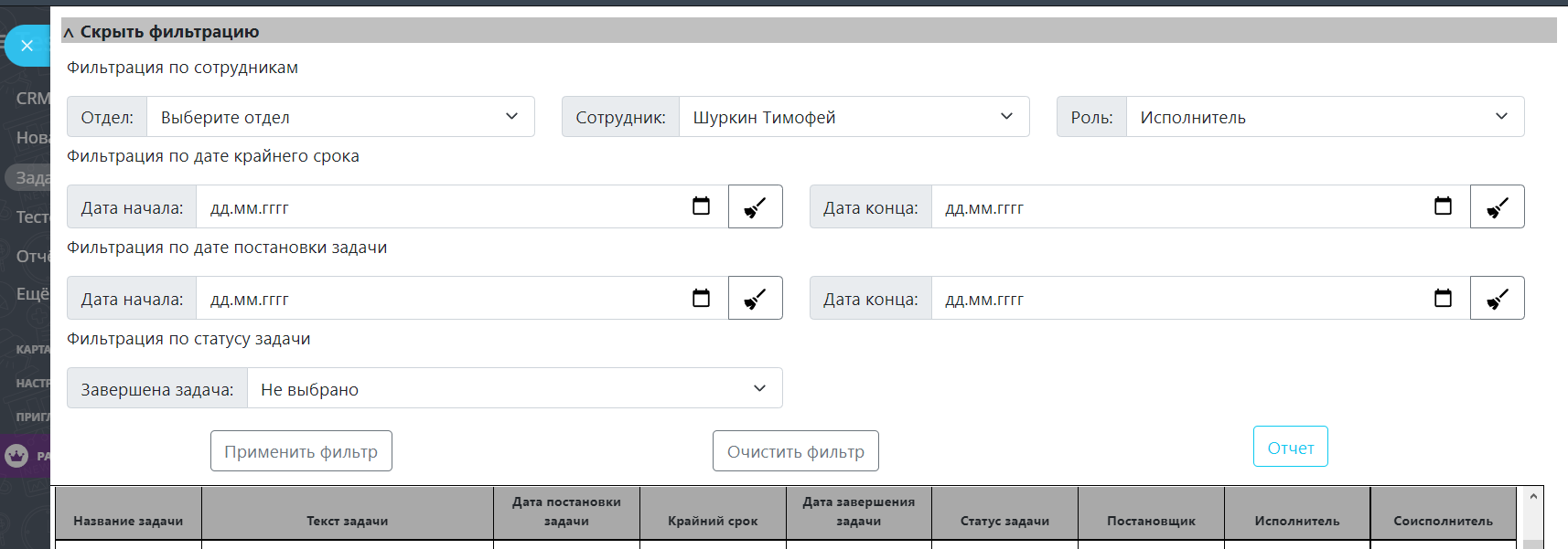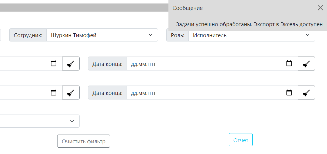 Готовый отчёт для эффективного контроля за задачами. Доступен Экспорт в Excel.