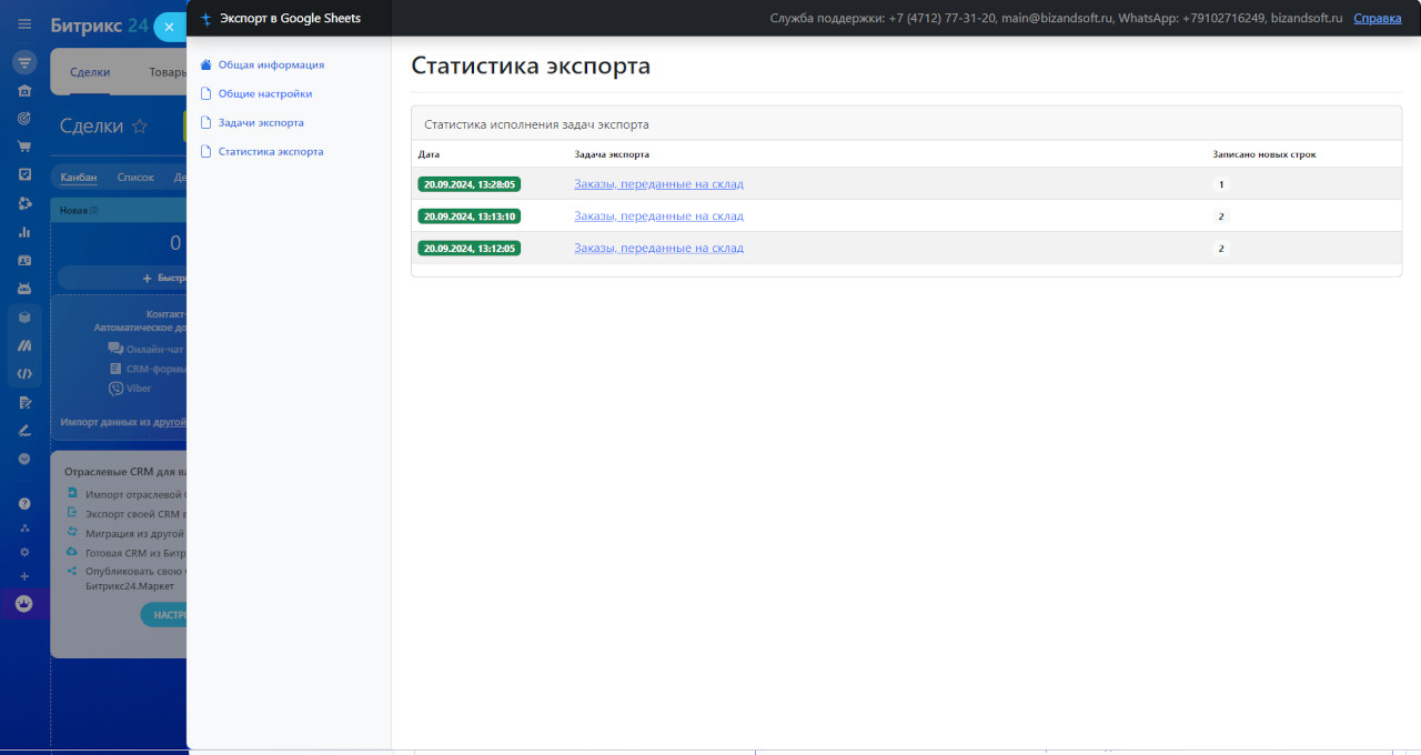 Приложение позволит автоматически выгружать данные из сделок и лидов по определённому признаку и условиям в документы Google Sheets с поддержкой множественных задач, перезаписи данных и записи на разные листы документа.