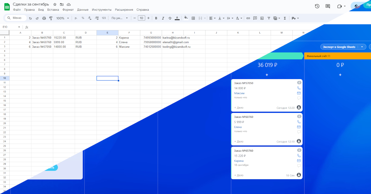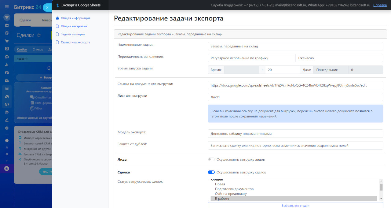 - Регулярно выгружать данные из лидов и сделок в документ Google Sheets, при этом используя индивидуальный набор данных и заполняя поля в документе только теми данными, которые действительно нужны;