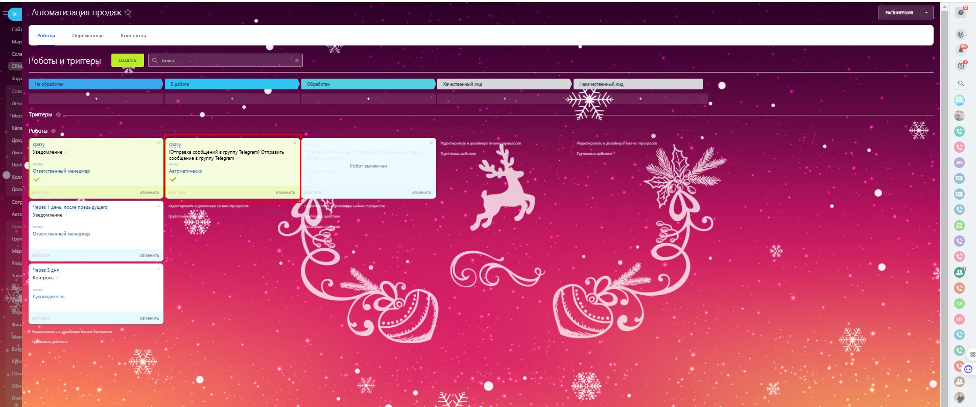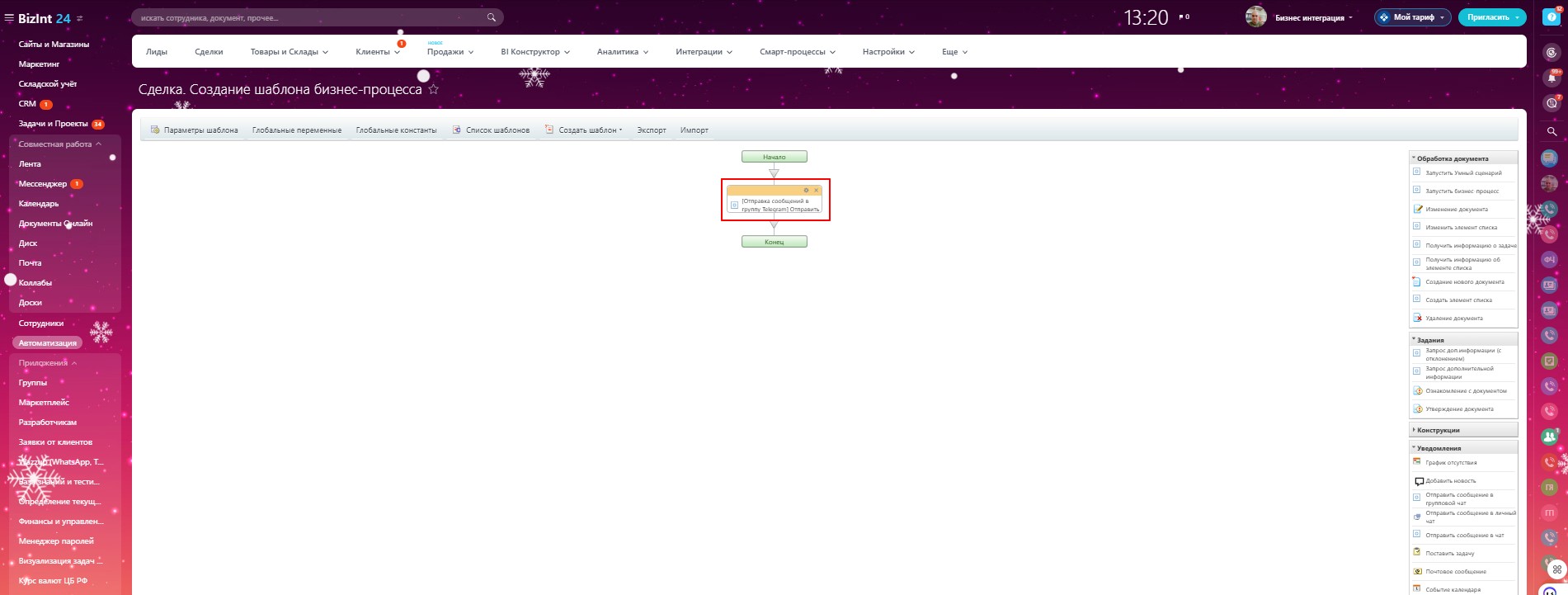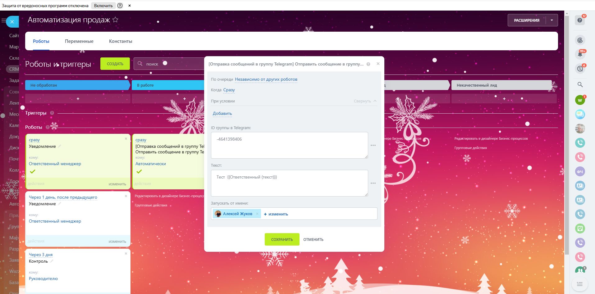 Отправляйте сообщения в группу Telegram, роботами из воронки продаж или лидов, либо из бизнес-процессов.