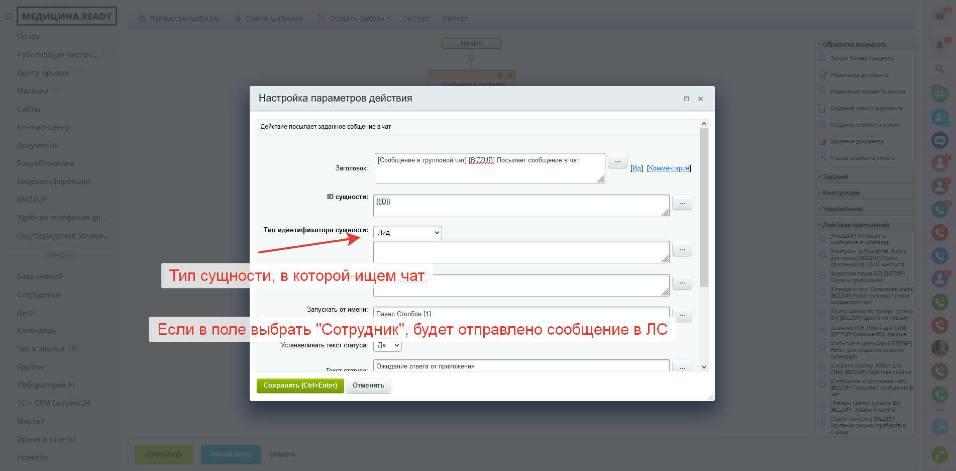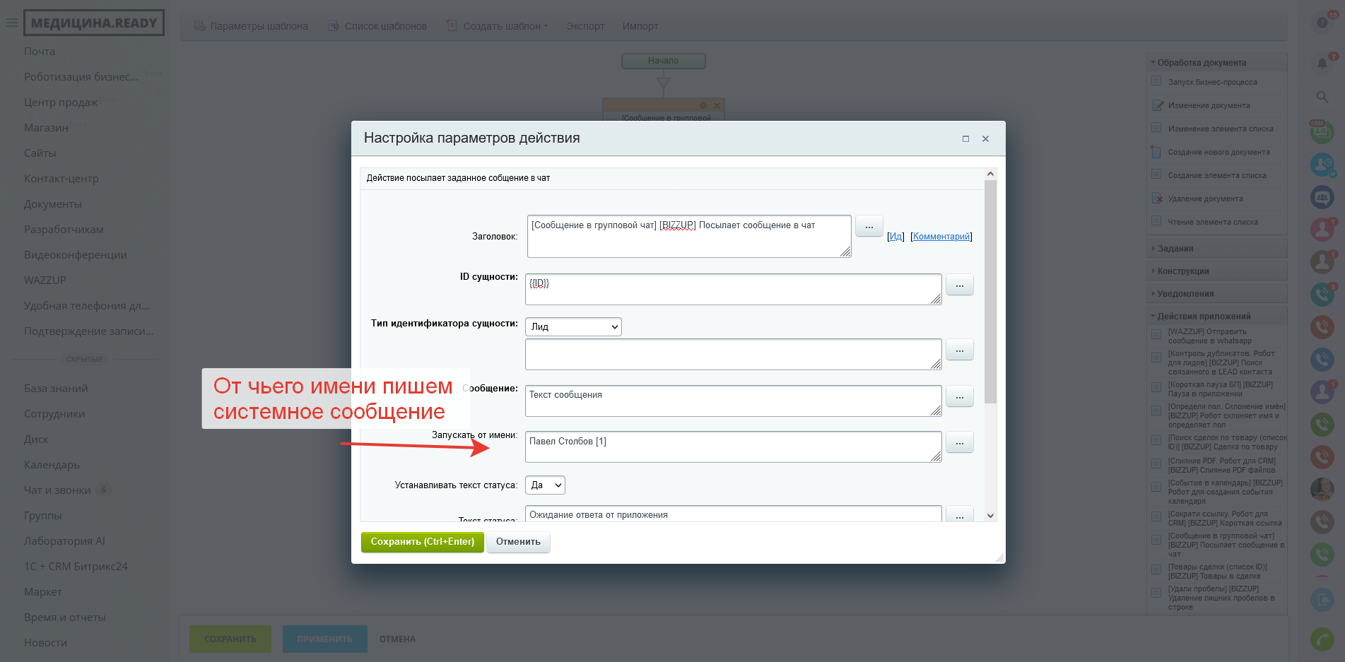 Активити бизнес-процесса позволяет отправить системное сообщение в чат, привязанный к сущности: лид, сделка, контакт, компания, созданный с помощью кнопки "Пригласить к обсуждению" и конкретному пользователю в личные сообщения. Инструкция по настройке активити в скриншотах.