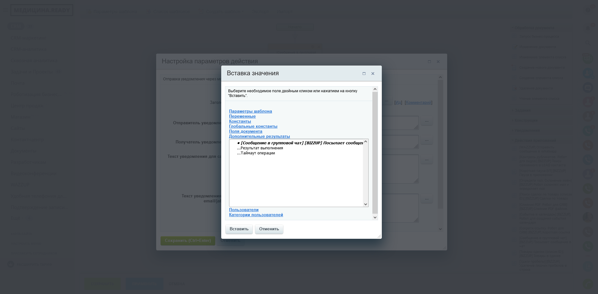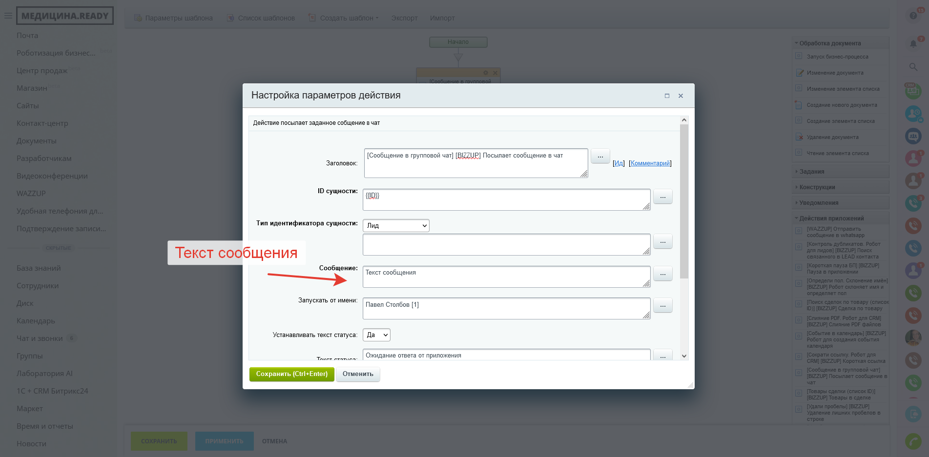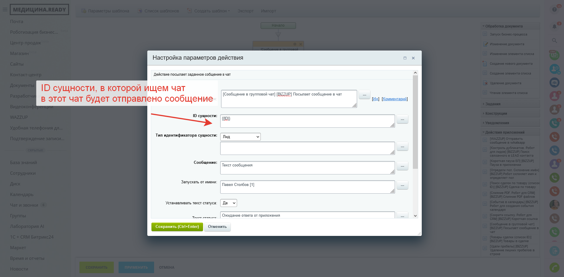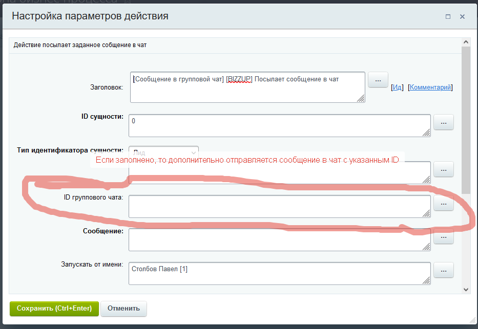 UPD от 14.02.2022. Добавили отправку сообщений в конкретный чат по указанному ID. Отправка в чат с указанным ID выполняется независимо от остальных настроек активити при заполнении соответствующего поля. При указании, например, личного чата и/или чата сущности, и одновременном заполнении поля "ID группового чата", сообщение будет направлено и туда и туда.