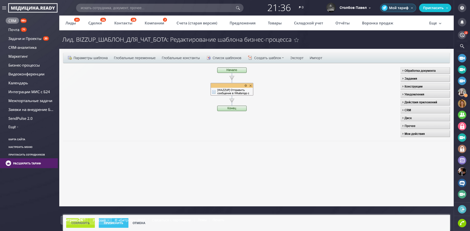 ВАЖНО! В случае, если вы случайно удалили установленный ботом шаблон Бизнес-процесса, его добавление осуществляется переустановкой бота в Битрикс24.Маркет.
