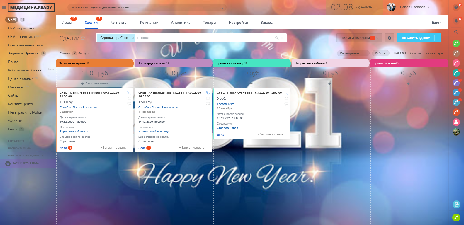 К созданному или существующему контакту создается сделка (запись на прием) с указанием пациента, специалиста, даты, времени записи, а также администратора, выполнившего запись. В случае изменения даты/времени приема в МИС, также меняем его в Б24. В случае отмены записи, бракуем сделку в Б24