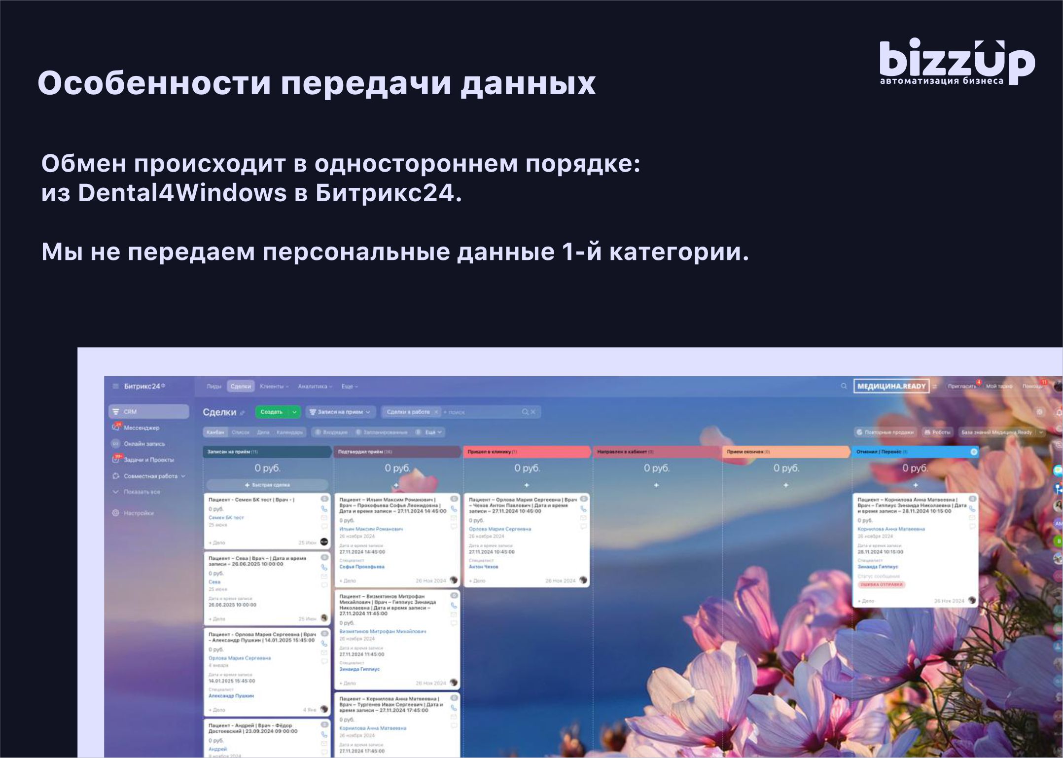 Приложение "Dental4Windows. Интеграция с Битрикс24" - это интеграционный модуль для односторонней синхронизации данных между медицинской стоматологической информационной системой Dental4Windows и Битрикс24. Мы не передаем персональные данные 1 категории (история болезни и любые другие данные, составляющие врачебную тайну). Мы не храним данные на сторонних серверах. Частота обмена зависит от мощностей вашего сервера. Наиболее часто используемая: 1 раз в 5 минут.