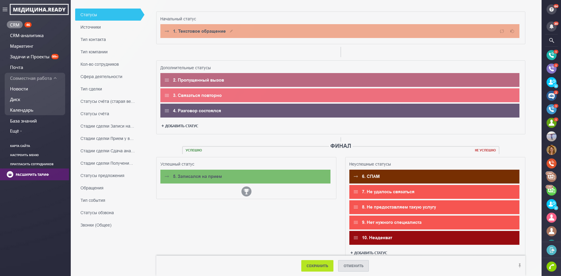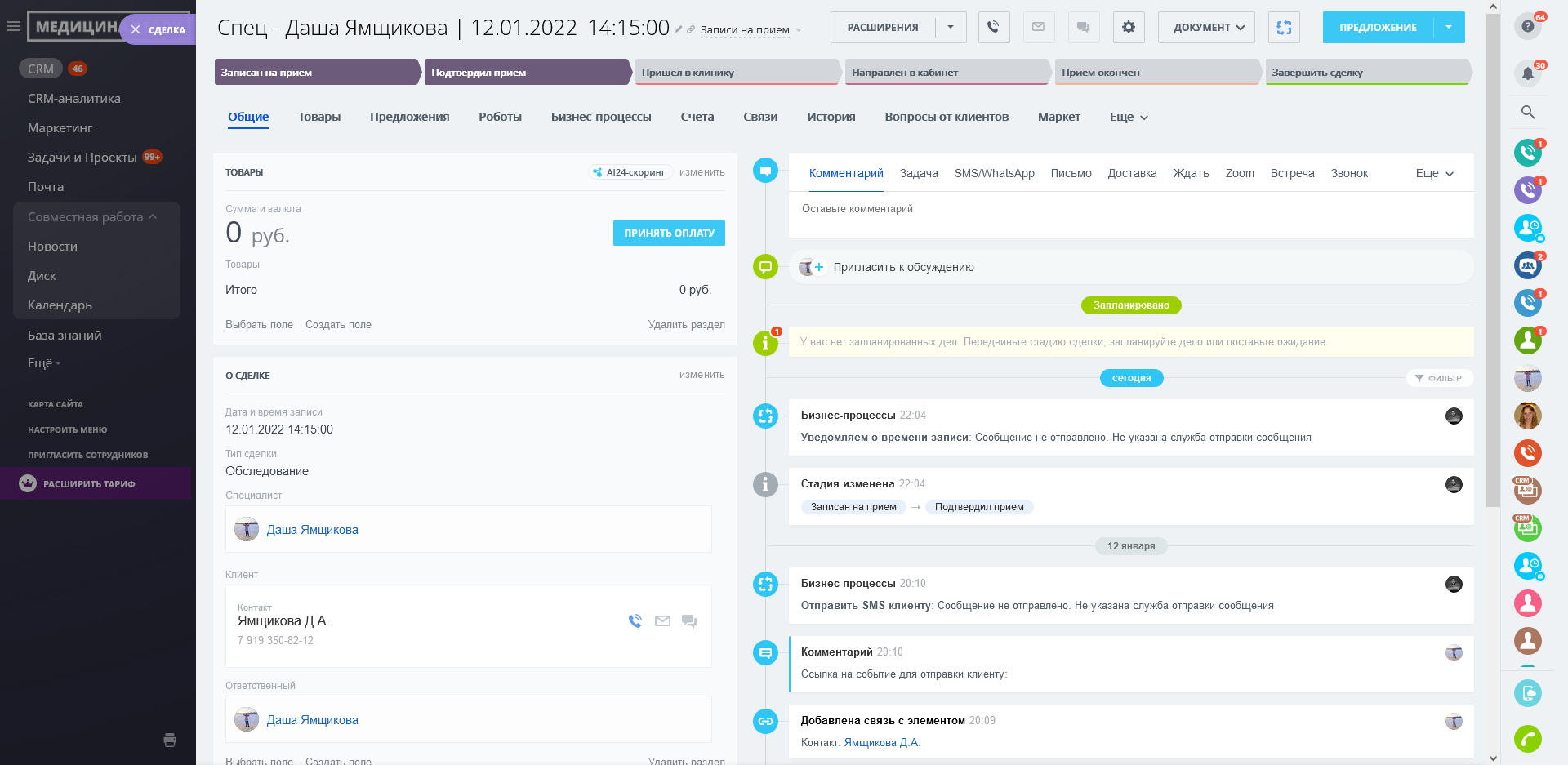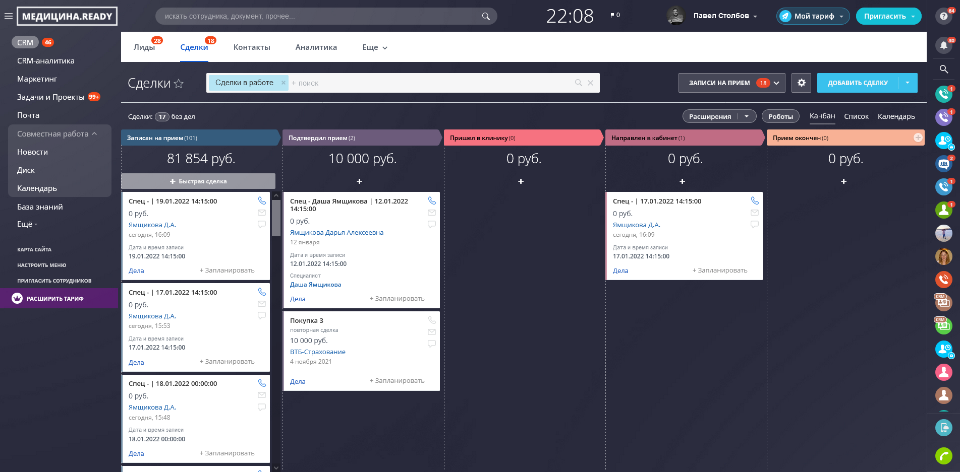 В готовой CRM для Медицинских центров и Стоматологий реализован следующий сценарий работы:
