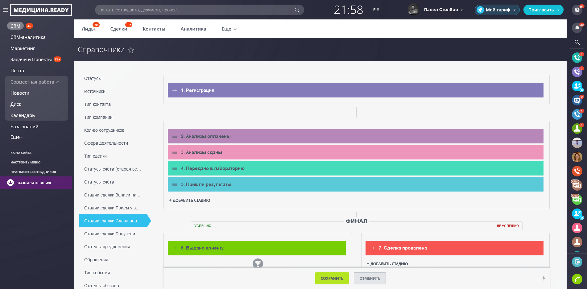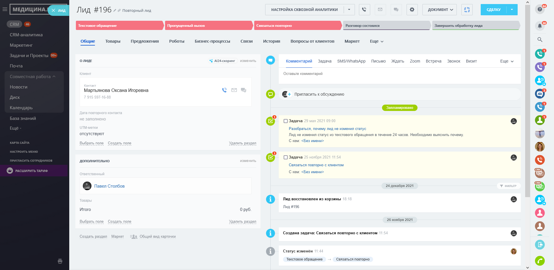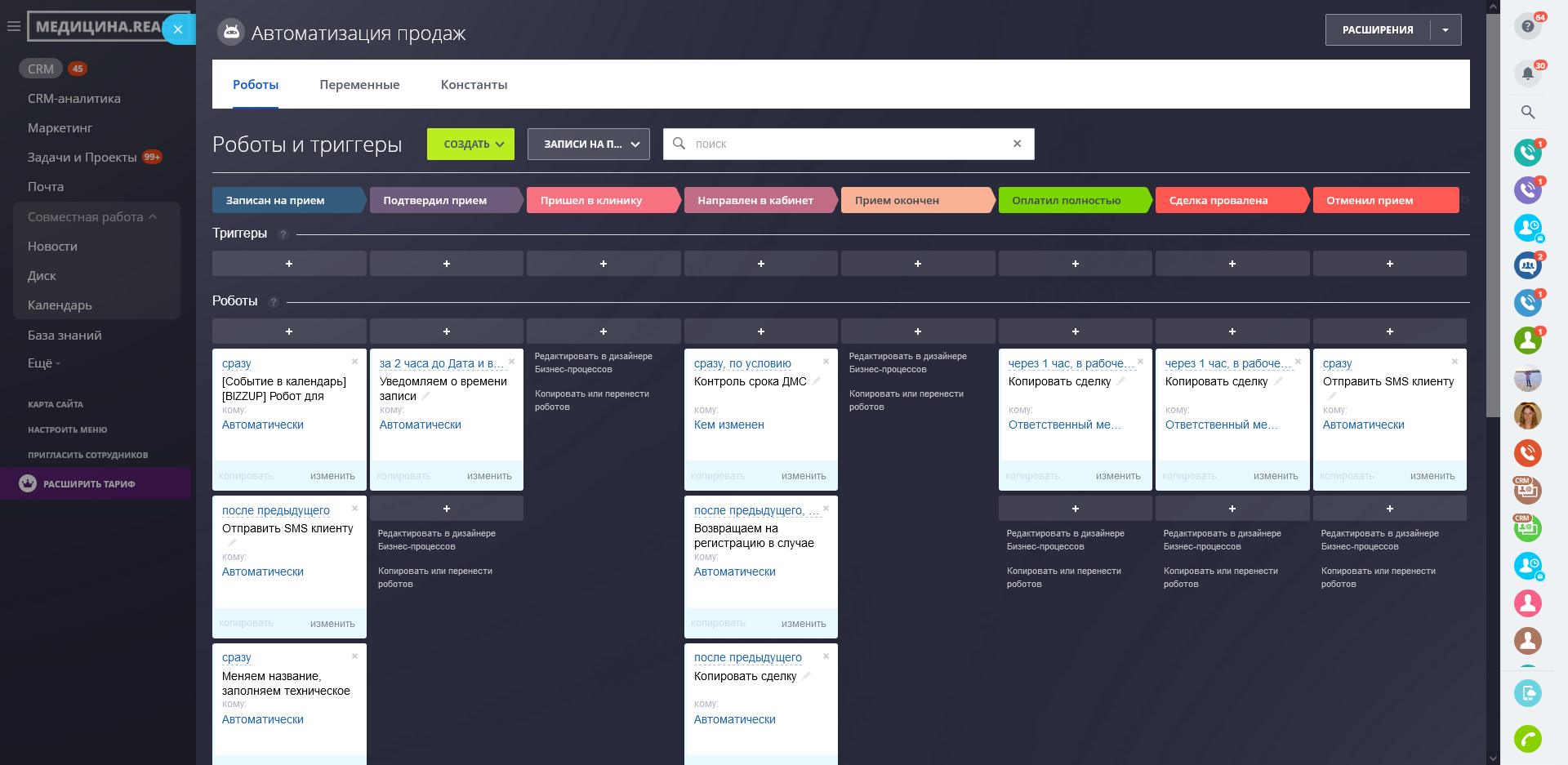 В готовой CRM для Медицинских центров и Стоматологий реализован следующий сценарий работы: