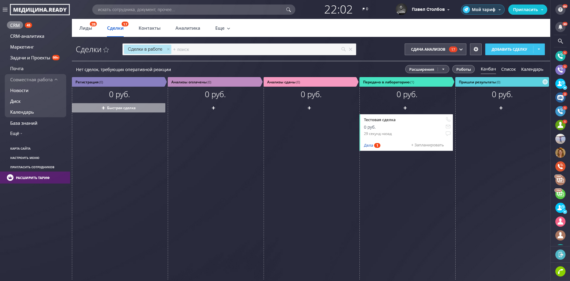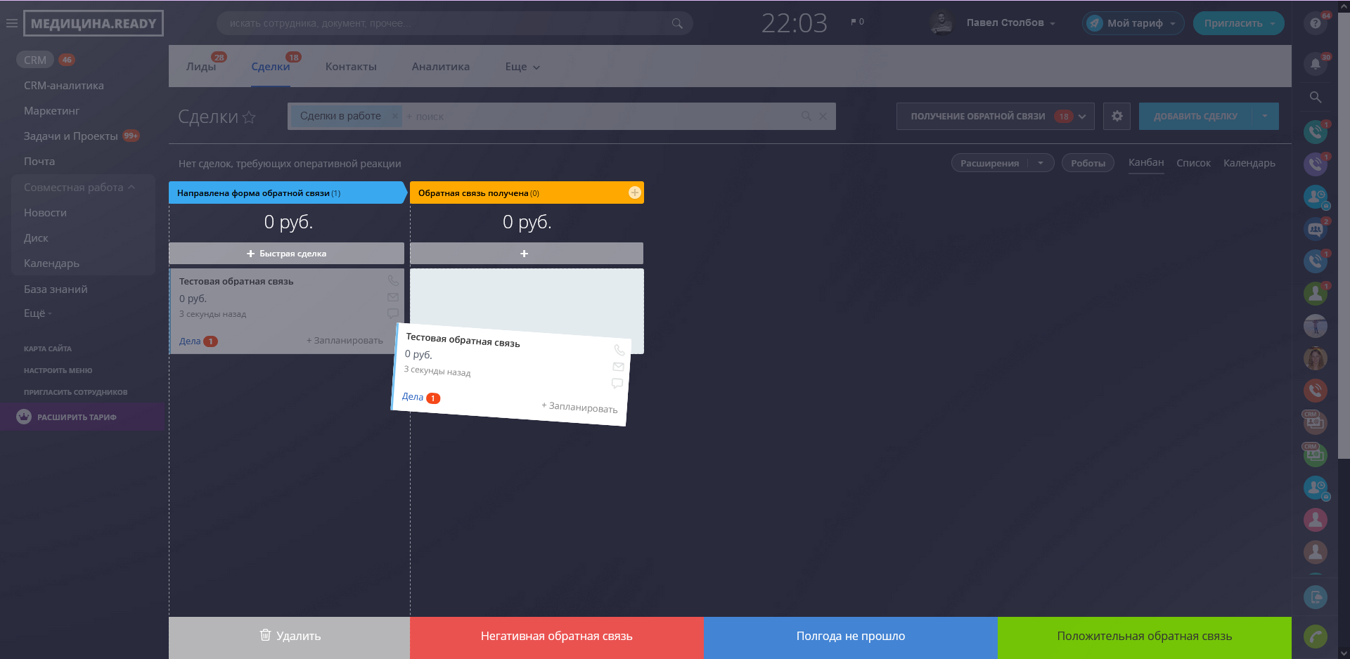 В случае необходимости возможно легкое подключение сайта, сквозной аналитики, 1С Предприятия с REAL-TIME обменом контактами, компаниями, товарами и заказами.