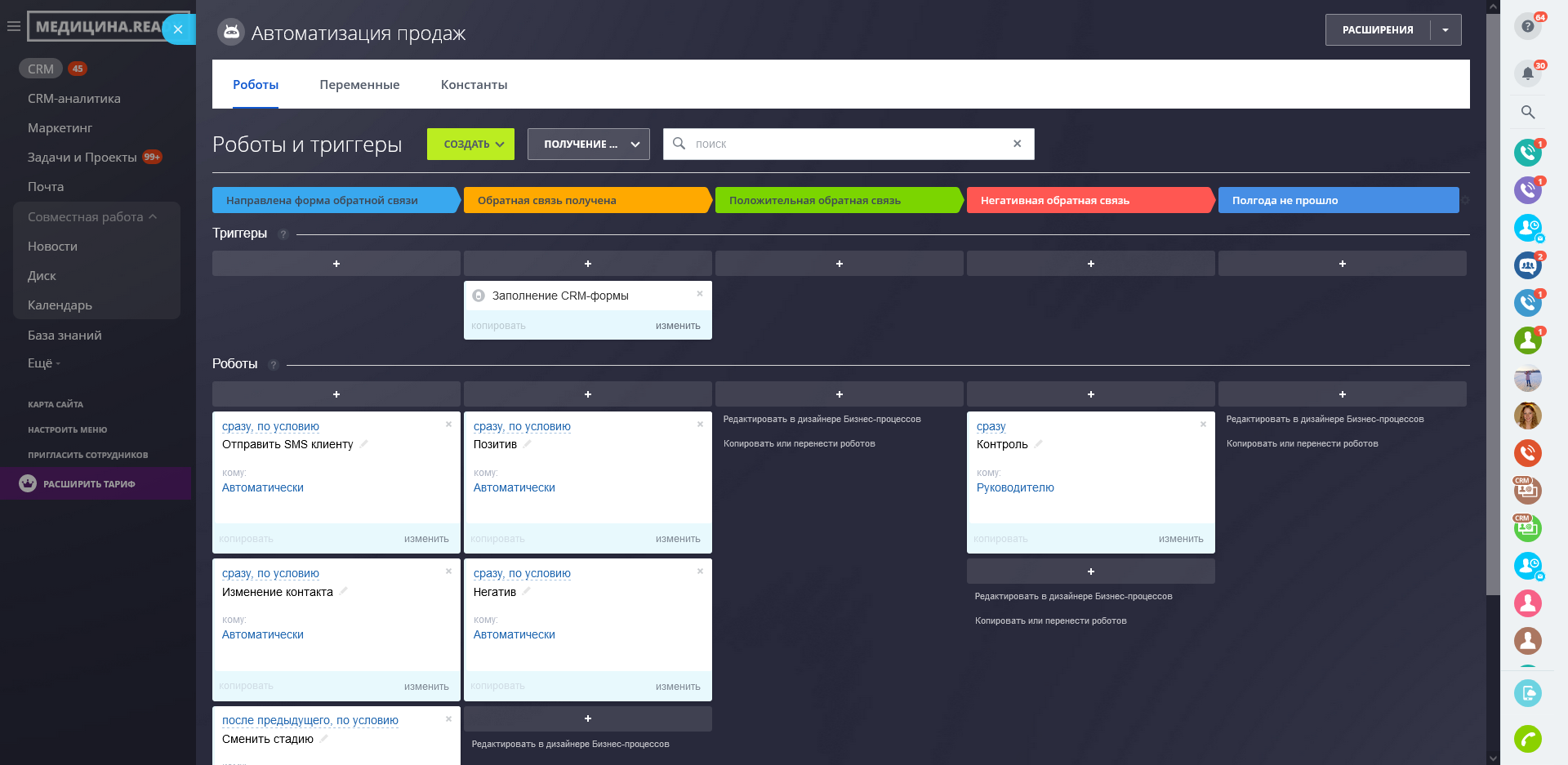- Сообщение в групповой чат - для автоматического отчета в групповой чат, привязанный к лиду/контакту/приему