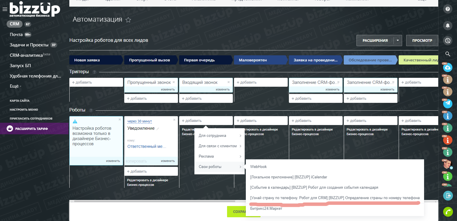 ГОТОВАЯ CRM ДЛЯ МЕДИЦИНСКИХ ЦЕНТРОВ И СТОМАТОЛОГИЙ Мы подготовили для вас сценарий работы, построенный на опыте общения с собственниками и коммерческими директорами более 30 медицинских учреждений. Подготовили решение, которое позволит увеличить эффективность работы персонала в 1,5 - 3 раза уже через несколько дней. Мы предусмотрели для вас следующие сценарии работы: запись пациентов на прием, контроль явки пациента на прием, регистрация пациента на ресепшен, приём врача, сдача анализов и сбор обратной связи!