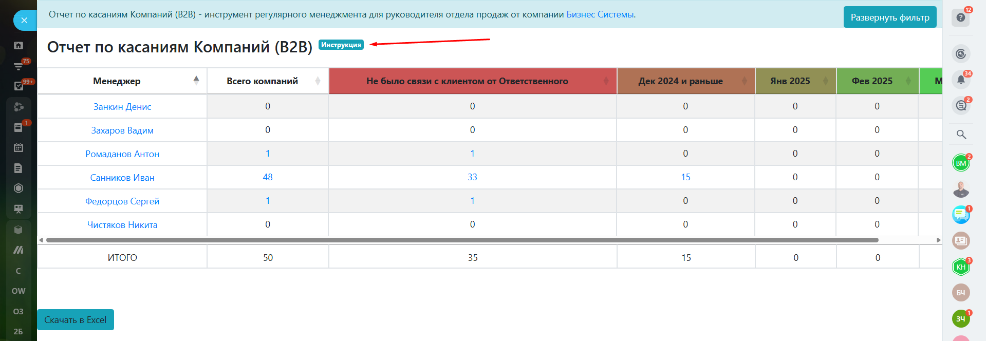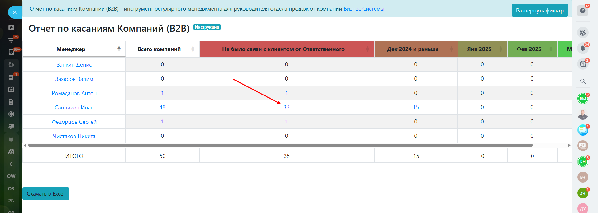 Отчет по касаниям Компаний покажет когда ваши менеджеры последний раз выходили на связь с вашими клиентами.
