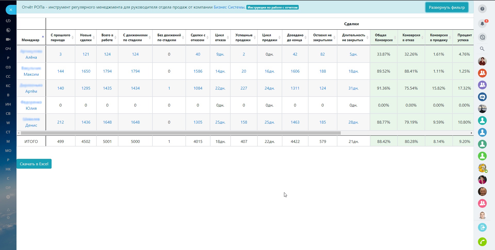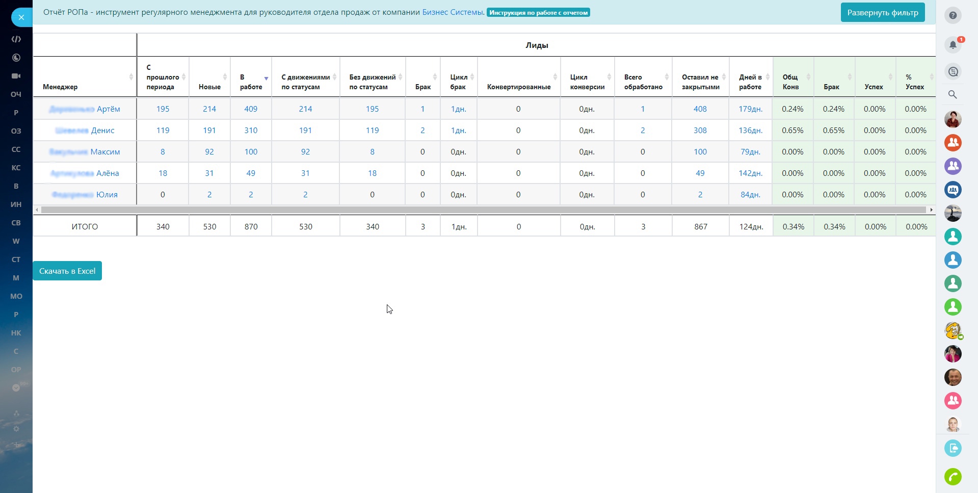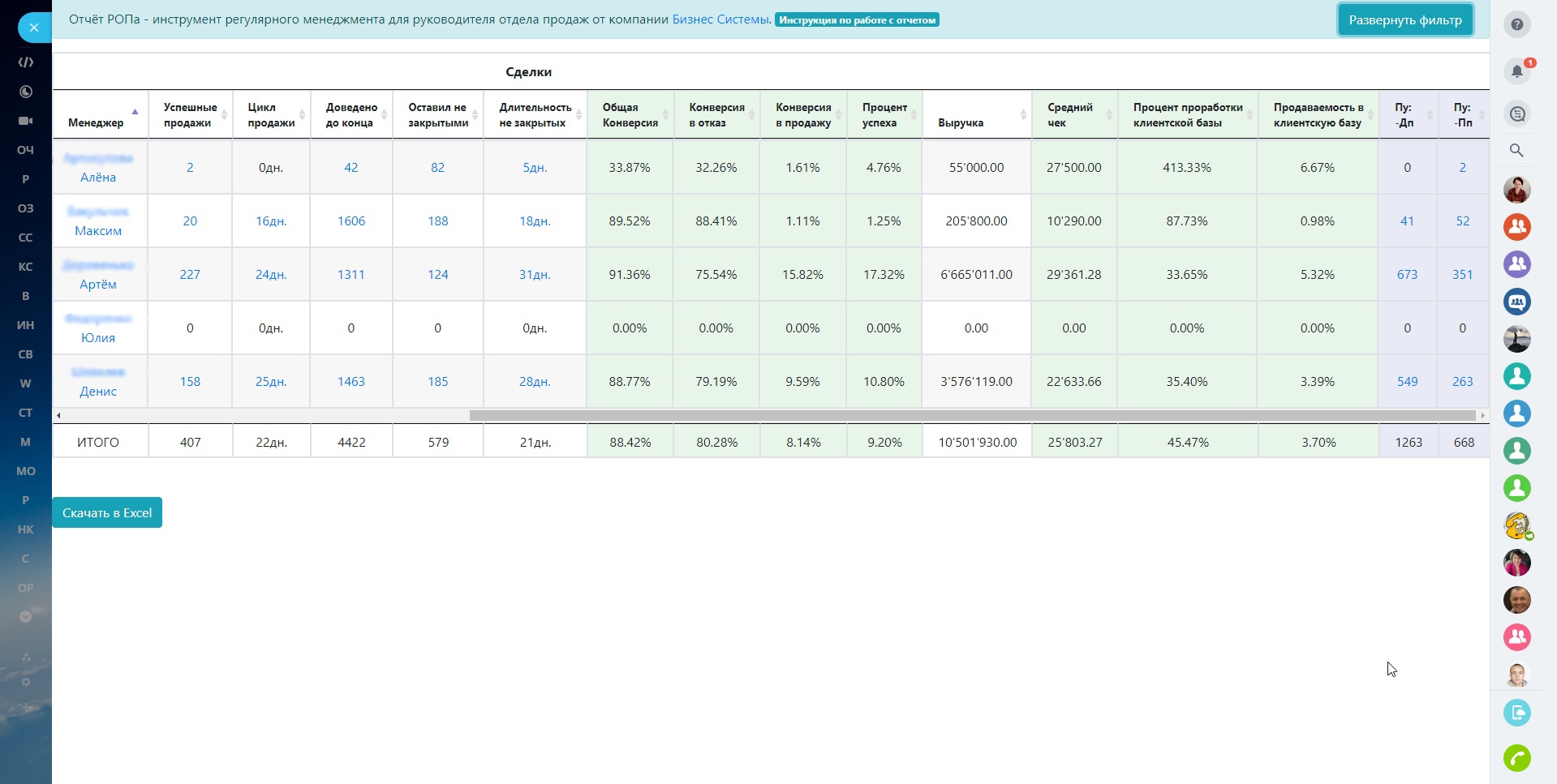 Отчет РОПа позволяет отследить эффективность работы как отдела в целом, так и каждого сотрудника