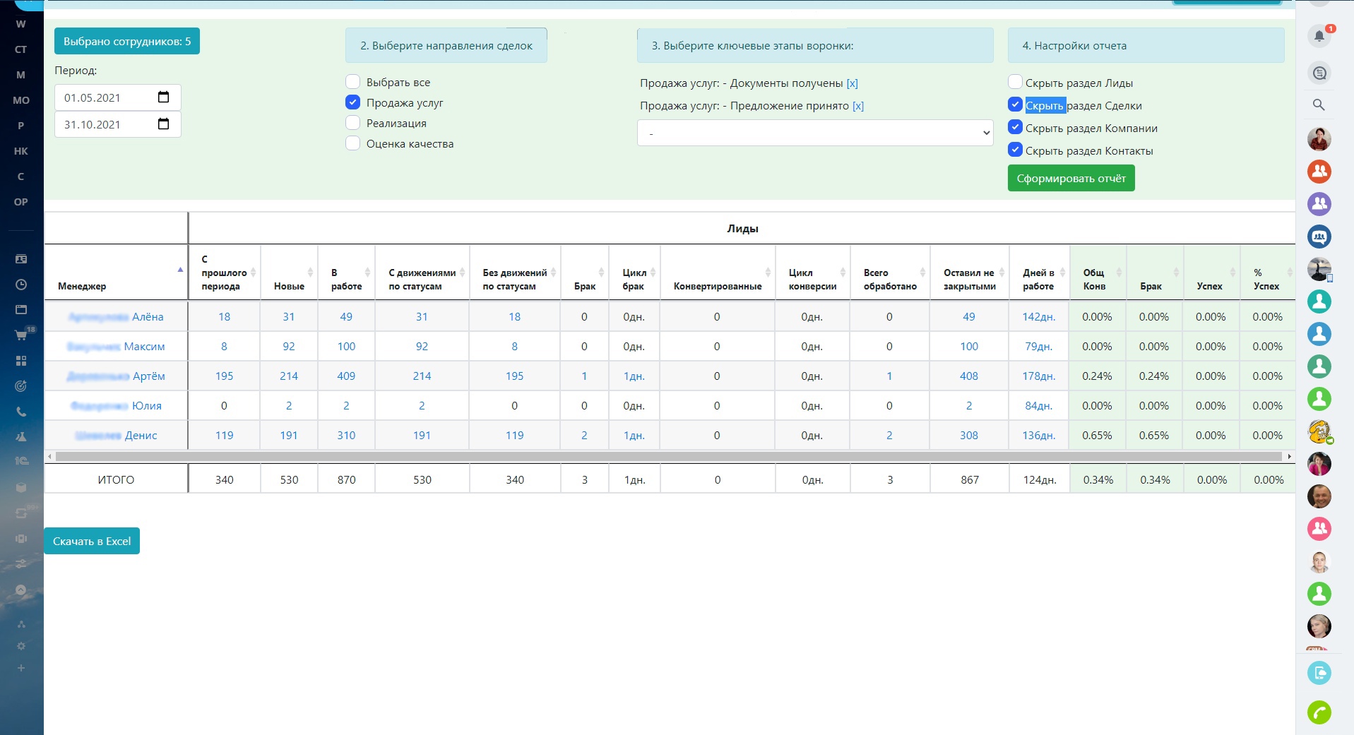 - последние две колонки – это показатели для ключевых стадий, в примере мы выбирали – «Документы получены» и «Предложение принято» – количество сделок по менеджеру, которые попали в нужные вам стадии.