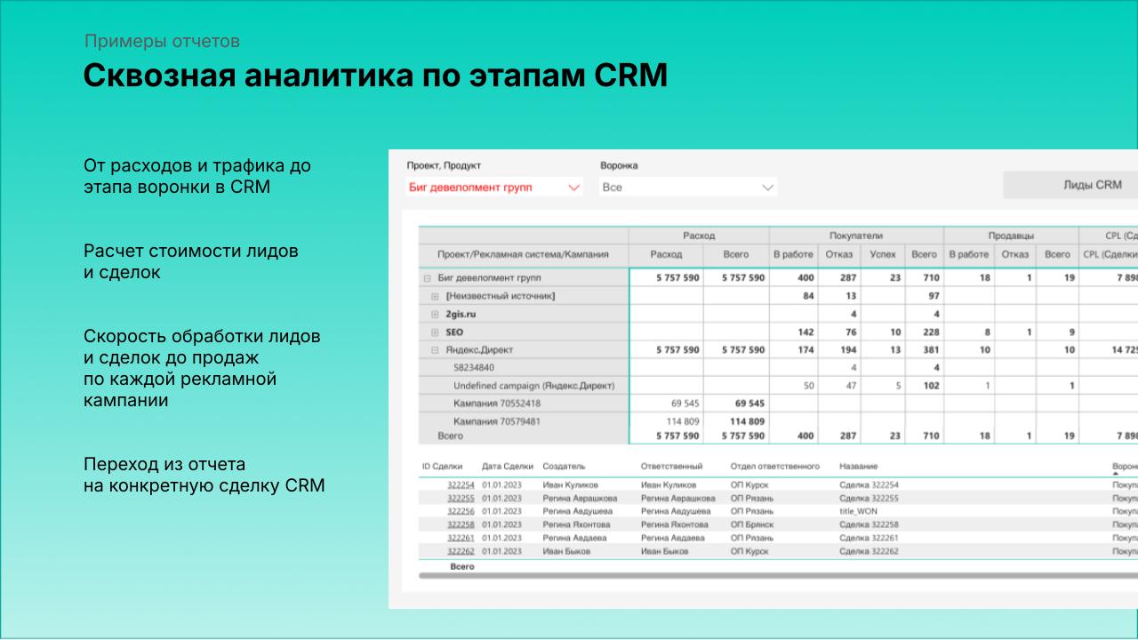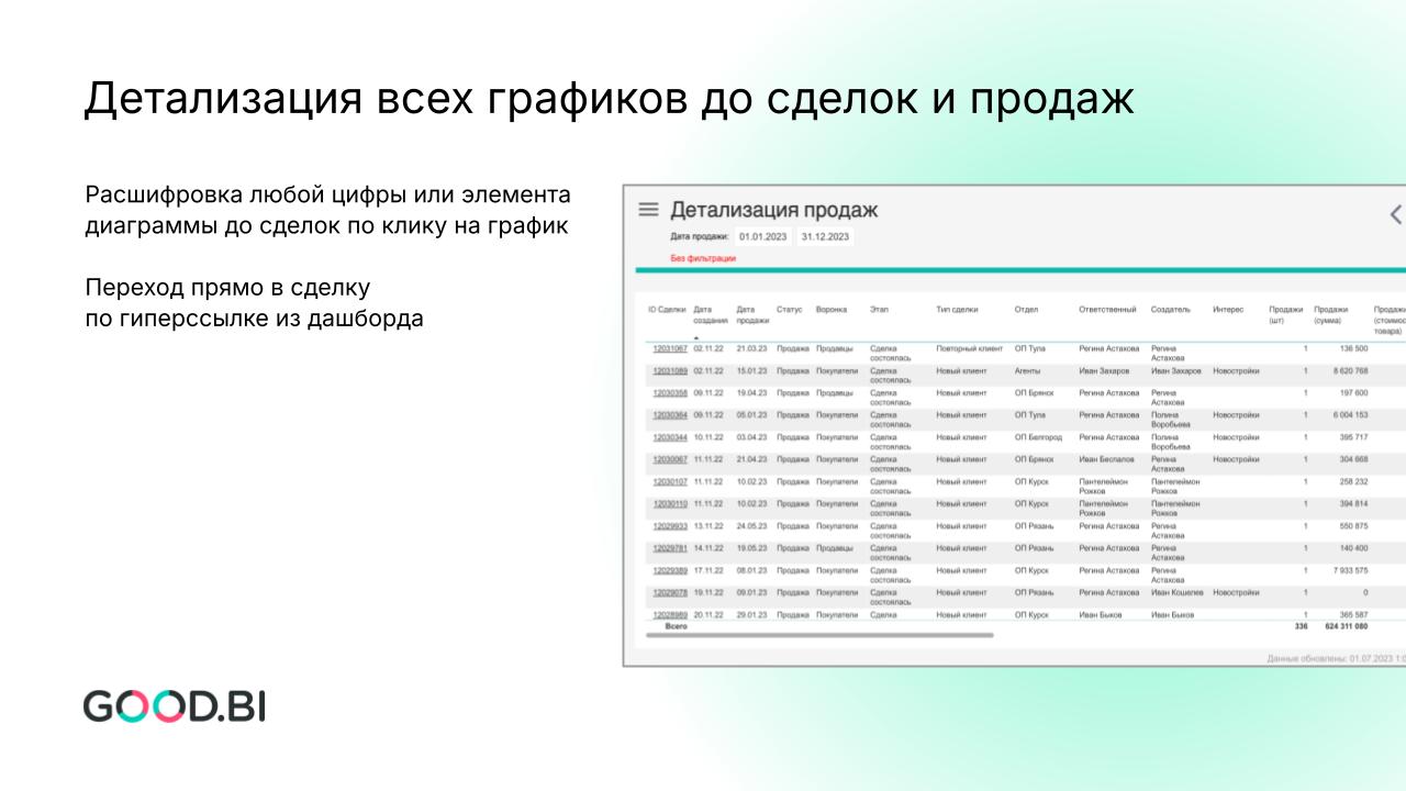 детализация (drill down) в 1 клик с каждого графика или таблицы в сделки или лиды Bitrix24,