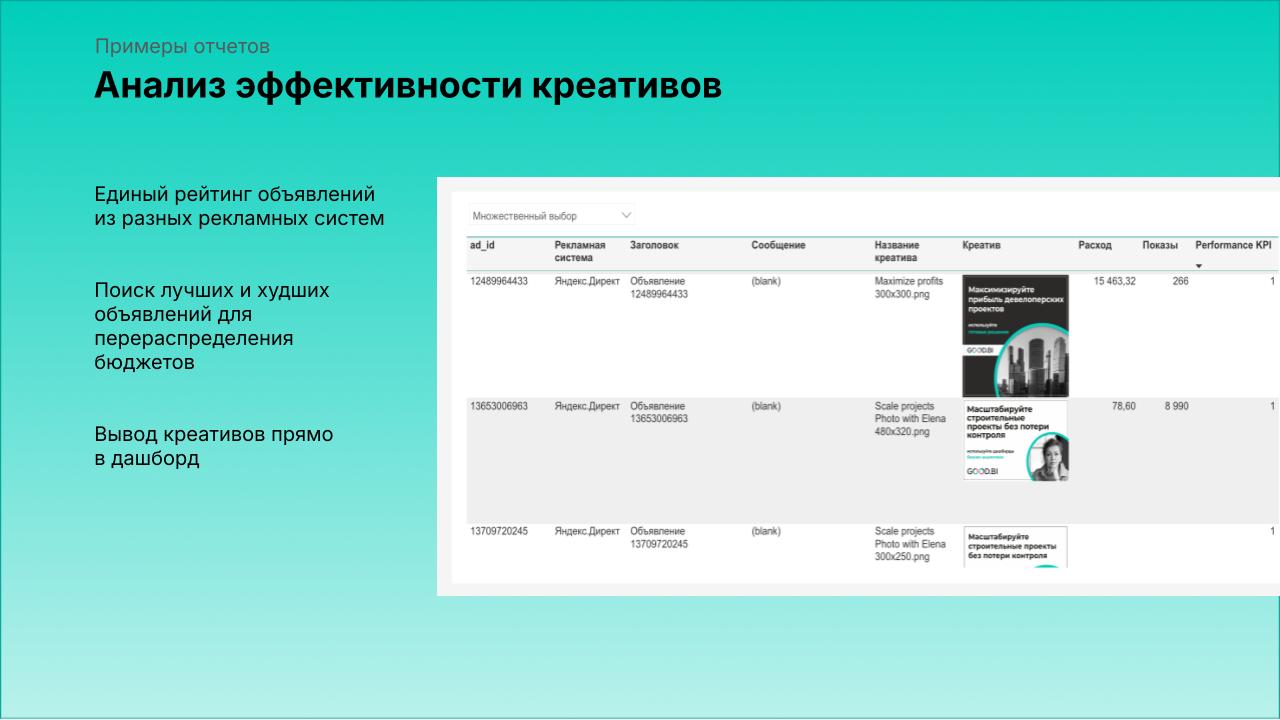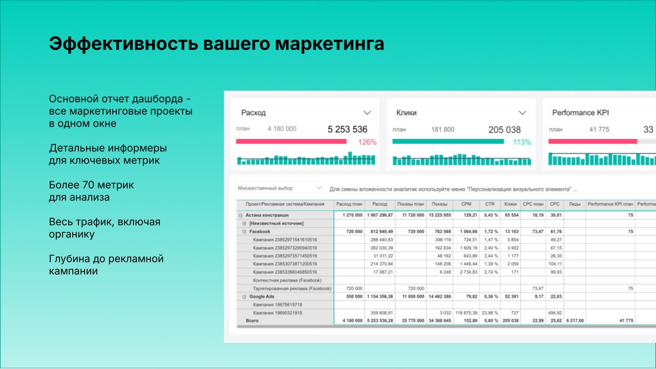 Дашборды с кабинетом для их гибкой настройки под ваши особенности ведения продаж и маркетинга позволят быстро навести порядок в работе и располагать визуализацией данных для презентации. Вы можете подключить свои рекламные кабинеты, коллтрекинги и системы сбора заявок, планы в Google Sheets и делиться отчетами с партнерами, предоставляя им доступ. Готовые витрины данных позволят вам быстро строить дополнительные дашборды в Power BI, Looker Studio (ex Google DataStudio), Yandex DataLens, Tableau и других визуализаторах.