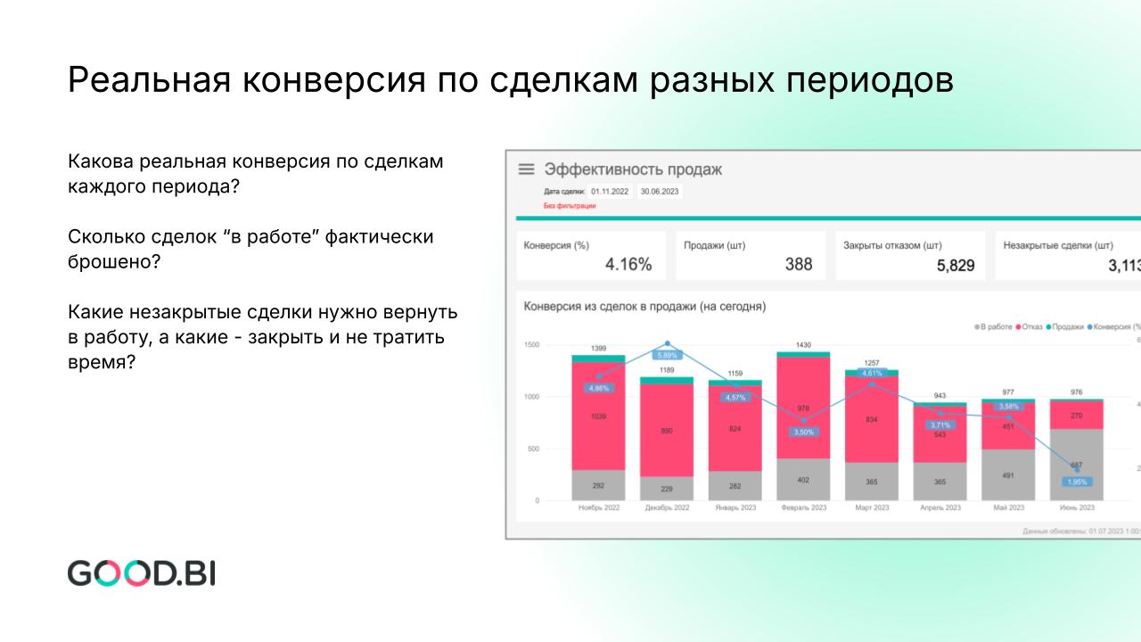 | Ни один лид или сделка не будут потеряны, а скорость продаж и конверсия заметно вырастут по результатам полного месяца ежедневного использования дашборда отделом продаж. |