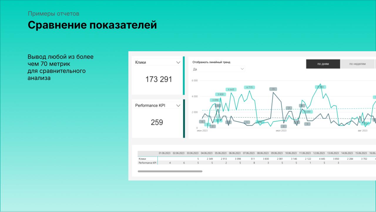 создавать свои кастомные отчеты на основе сырых данных или подготовленных витрин данных, подключившись к хранилищу напрямую или через коннекторы BI систем.