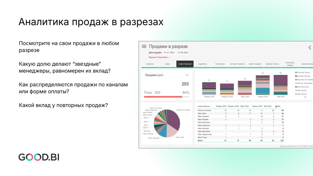 2. Дашборд продаж - продуманный комплекс отчетов - содержит все накопленные вами данные для: