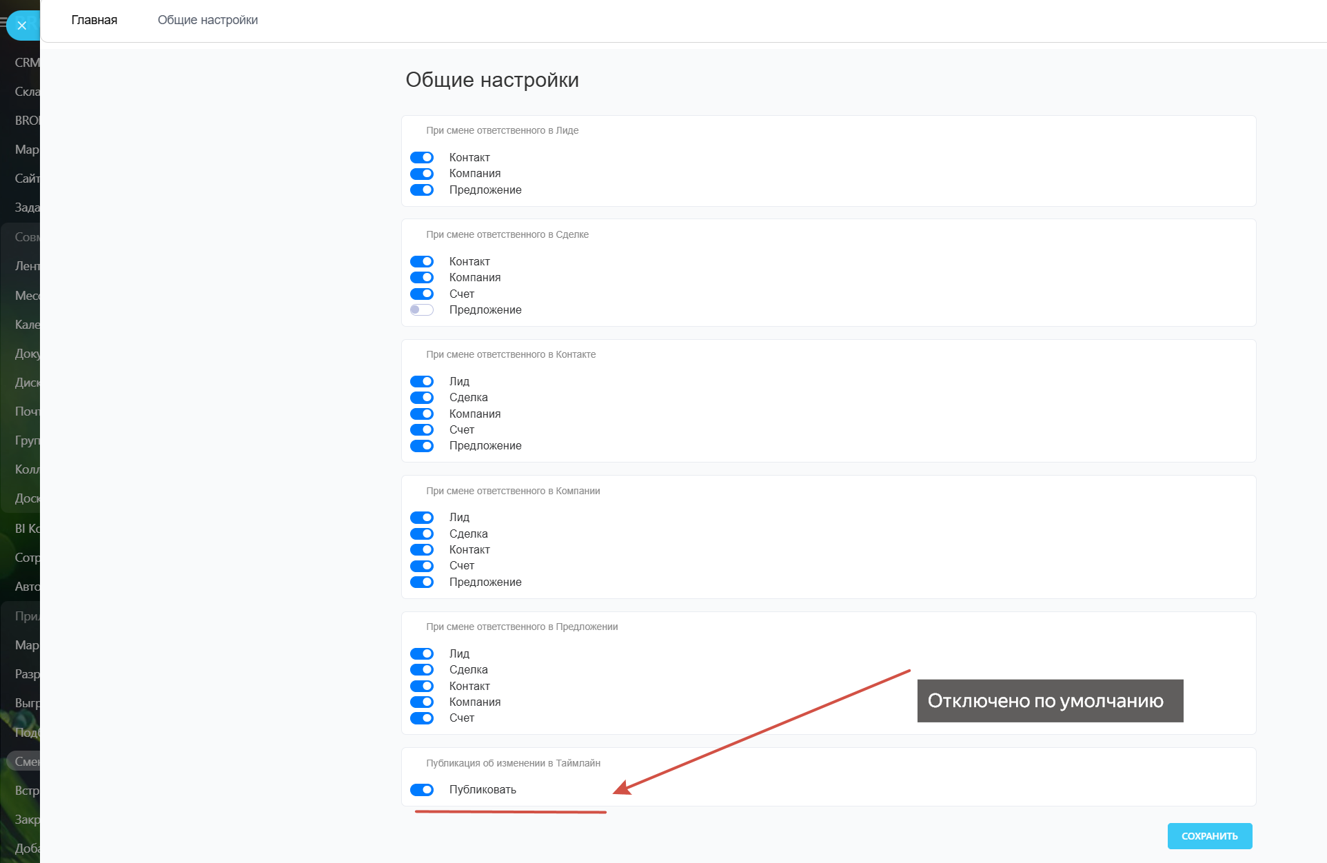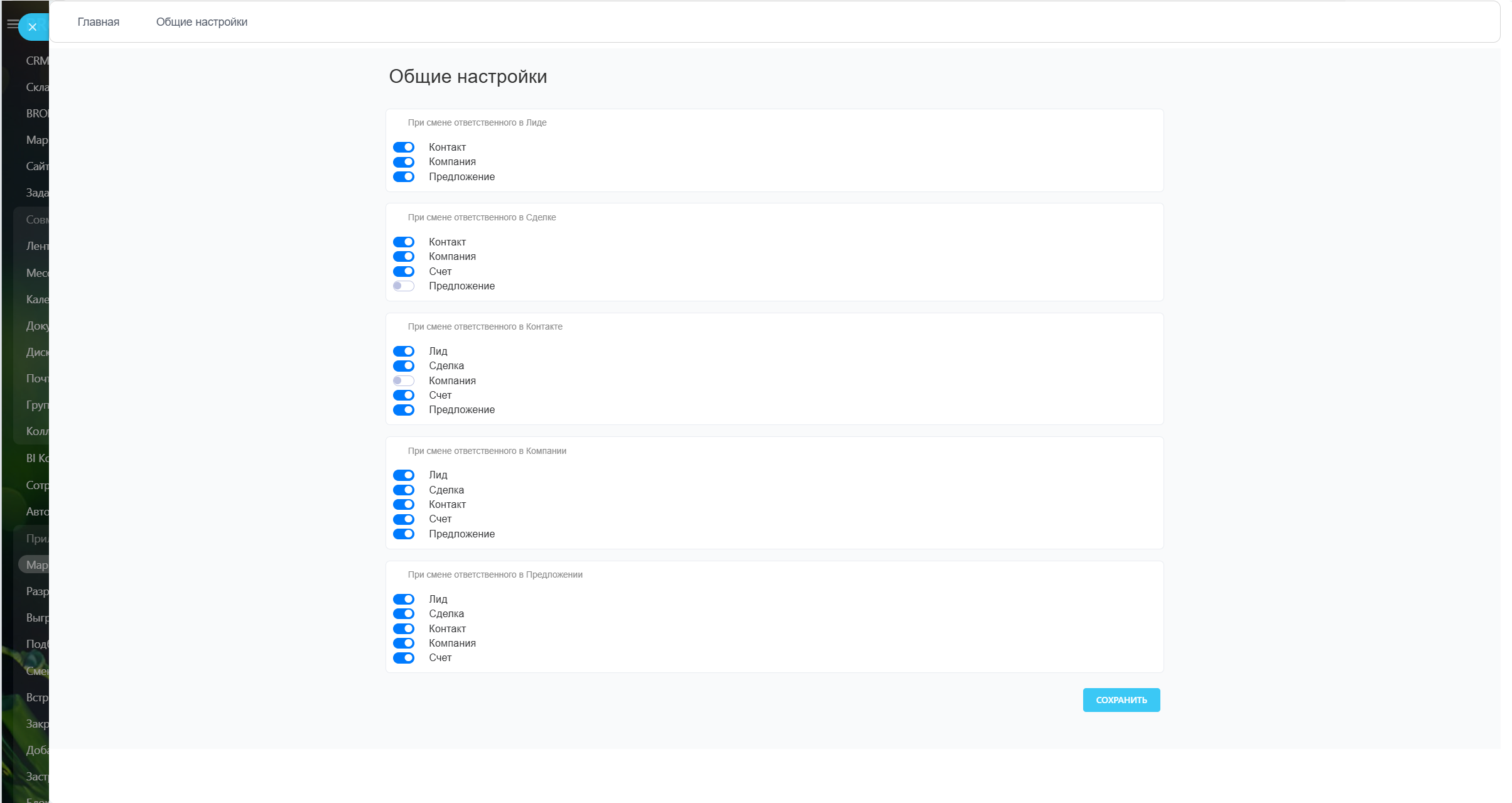 5) Перейдите в раздел "Общие настройки" и установите правила замены ответственного для каждой сущности CRM.