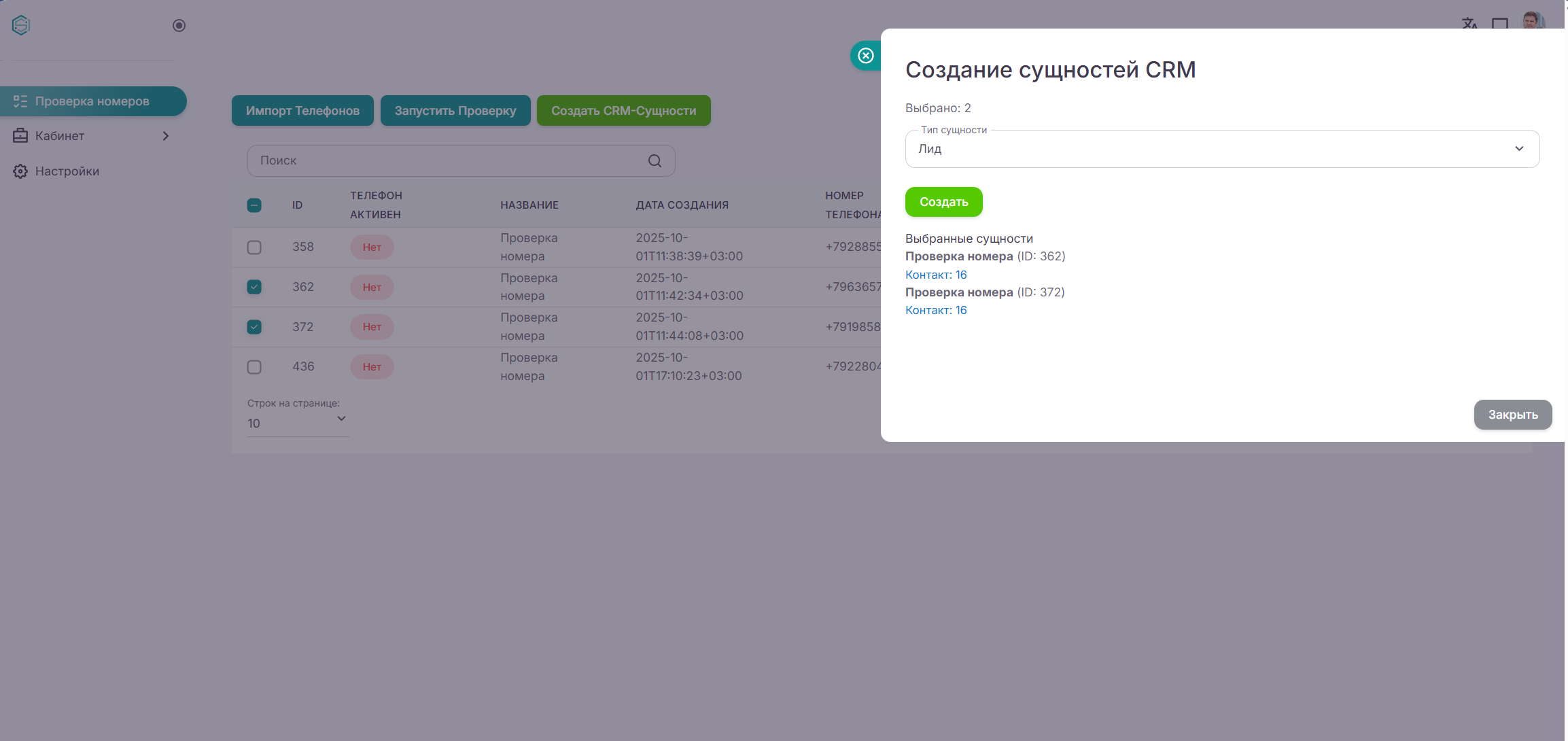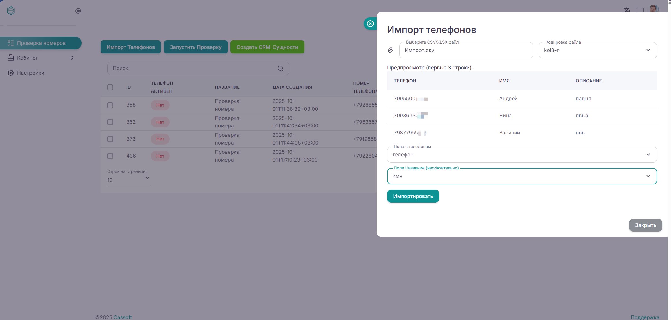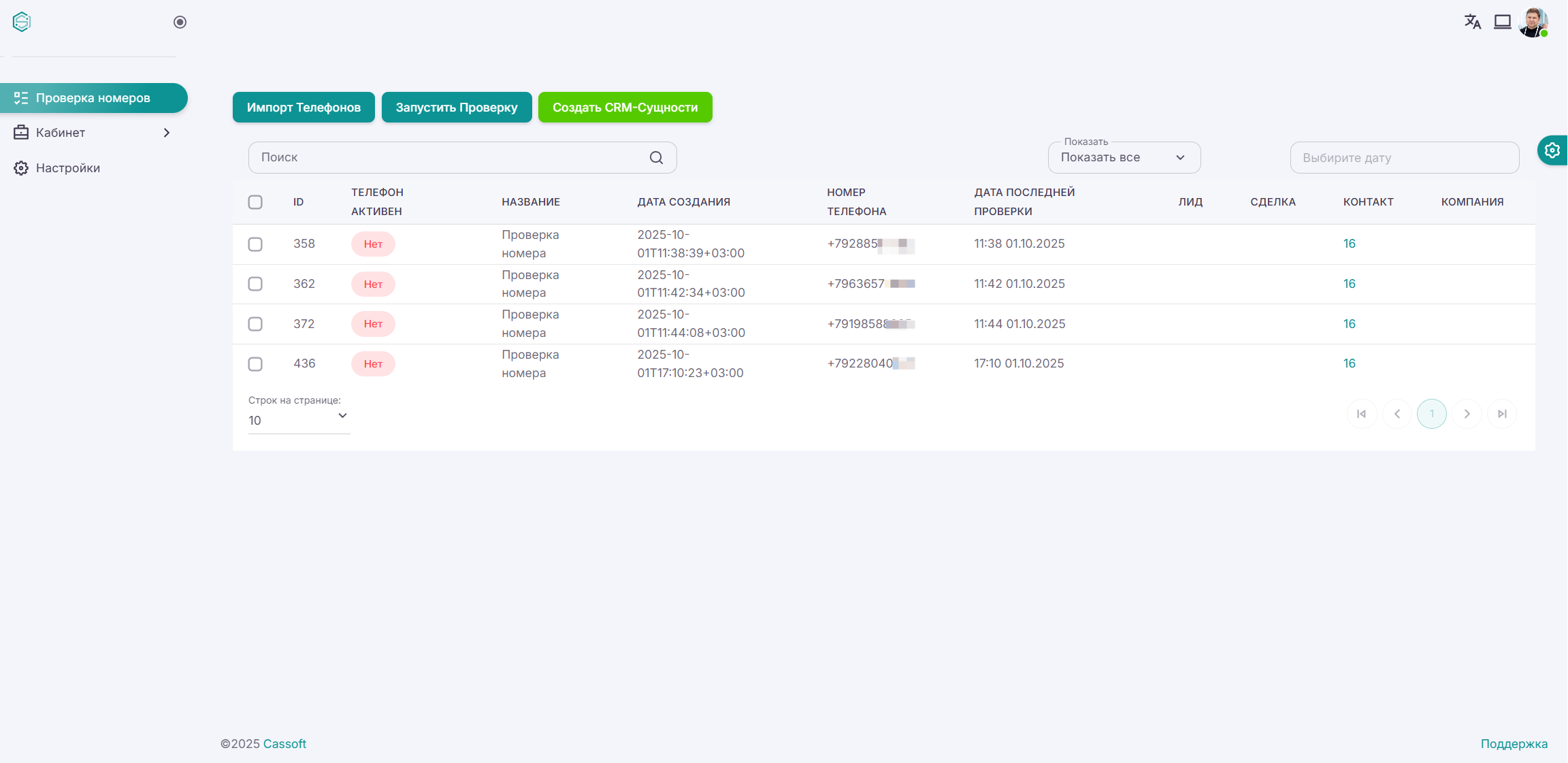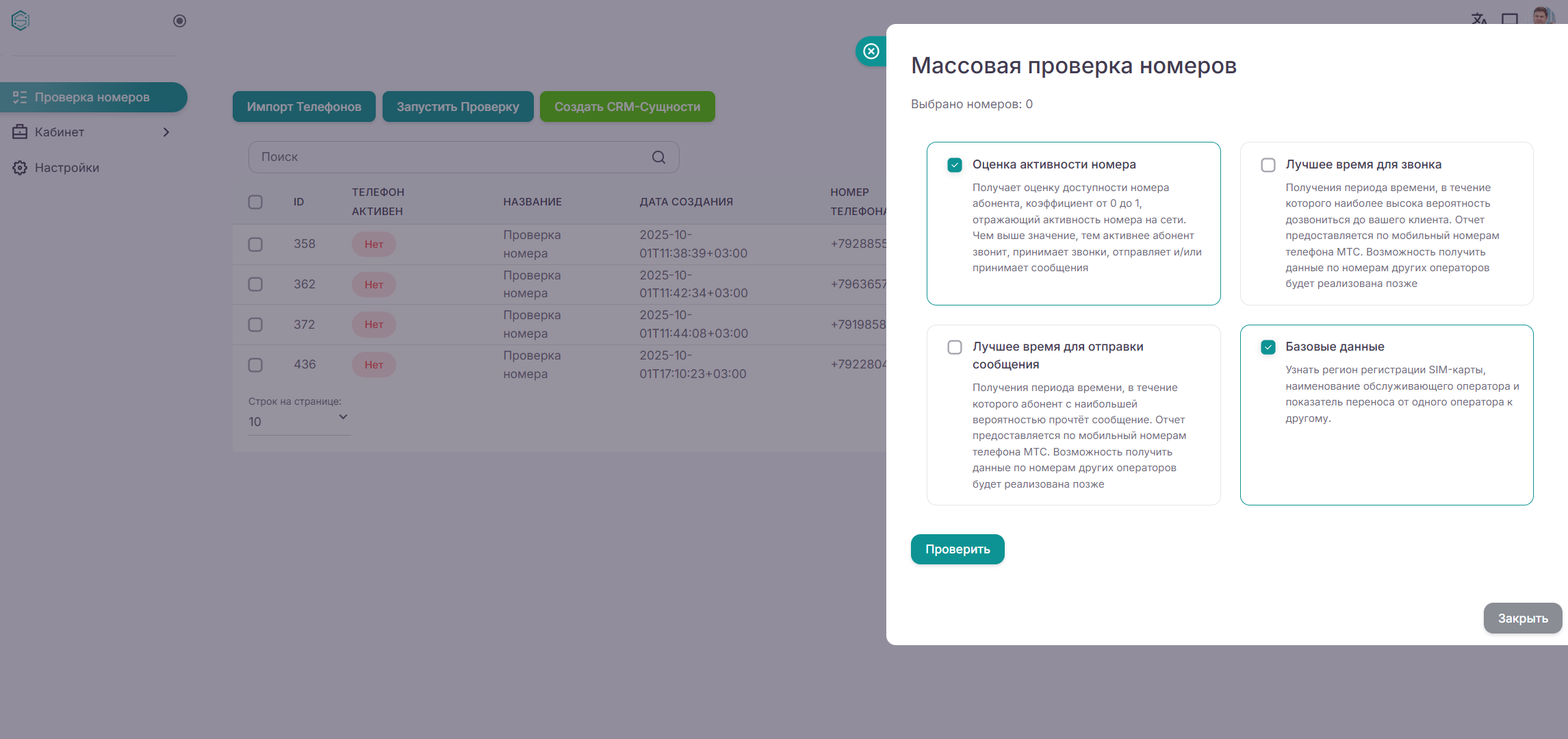 Проверяйте номера телефонов, конвертируете в контакты только актуальные номера. Это повысит результаты ваших маркетинговых и сервисных рассылок. Сократит время на не нужные дозвоны не существующим клиентам.