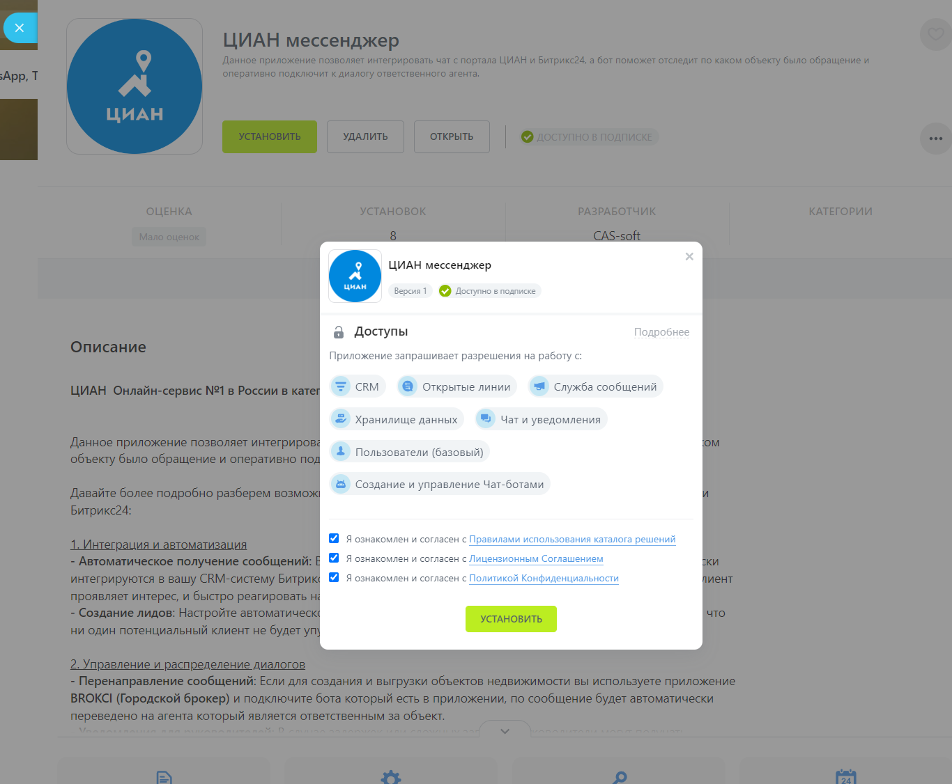 Данное приложение позволяет интегрировать чат с портала ЦИАН и Битрикс24, а бот поможет отследить, по каком объекту было обращение, и оперативно подключит к диалогу ответственного агента.