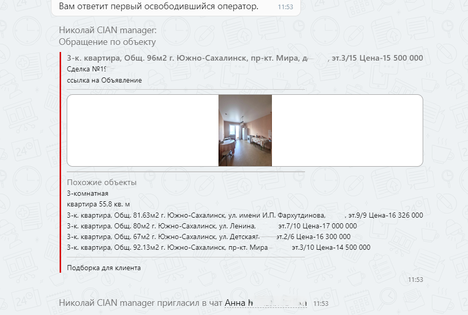 - Автоматическое получение сообщений: Все сообщения от клиентов, поступающие через ЦИАН, автоматически интегрируются в вашу CRM-систему Битрикс24. Это позволяет вам мгновенно видеть, по какому объявлению клиент проявляет интерес, и быстро реагировать на его запросы.