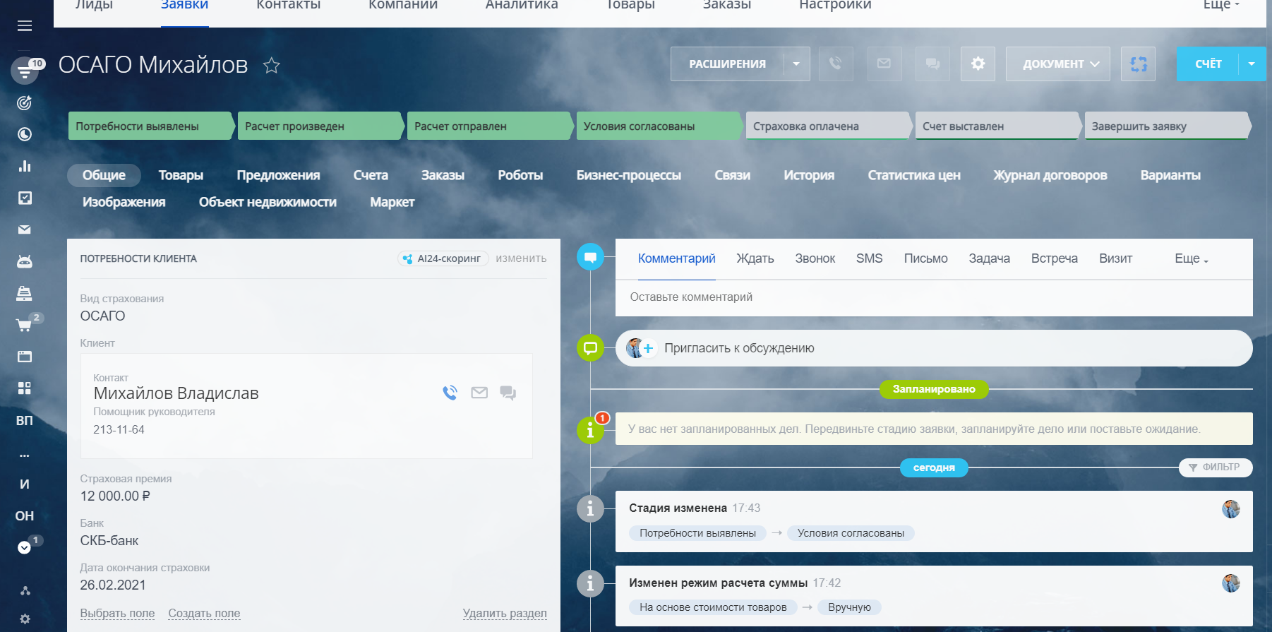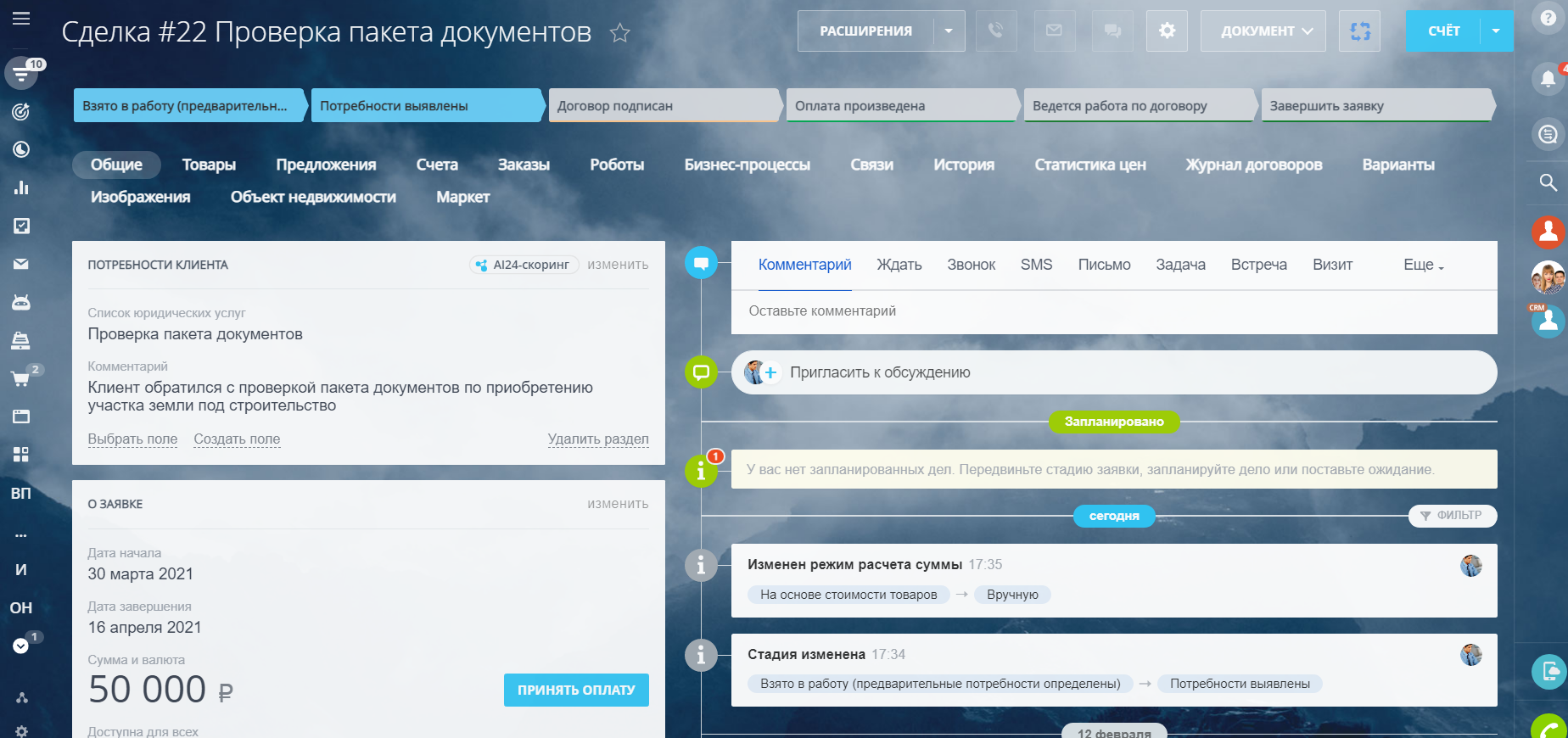 Для того, чтобы работать с большим количеством информации было удобнее, в решении настроены карточки лида, контакта и сделки, состоящие из разделов, объединяющих логически связанные поля.