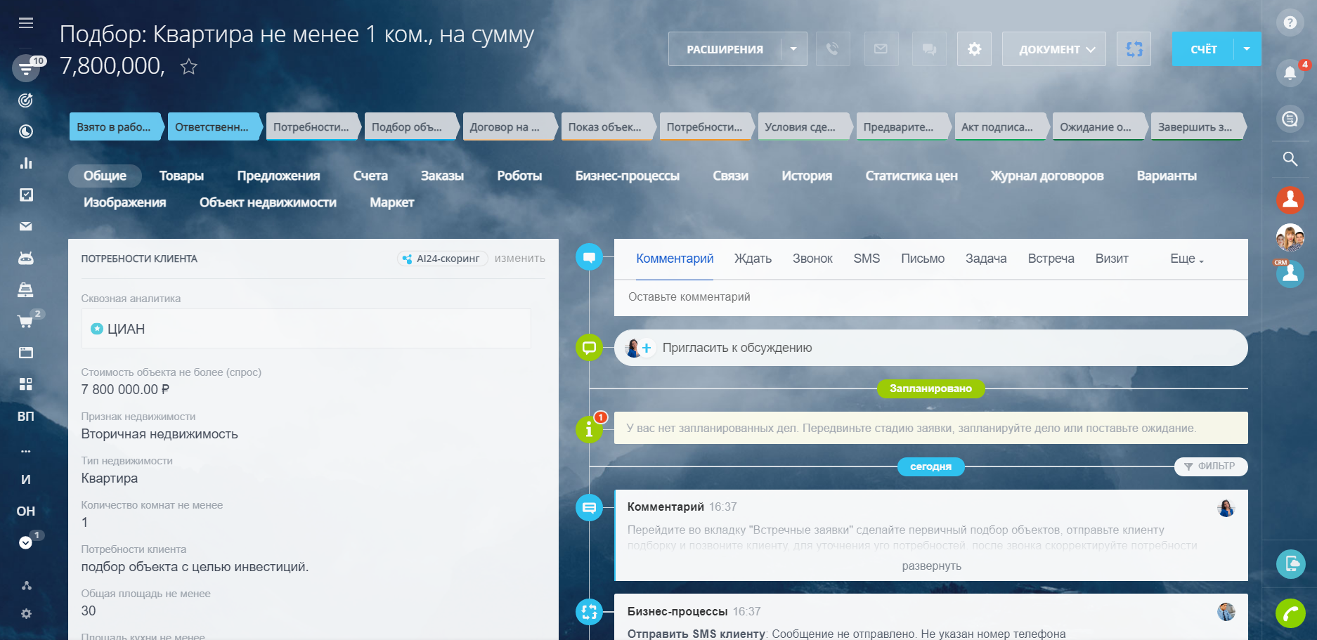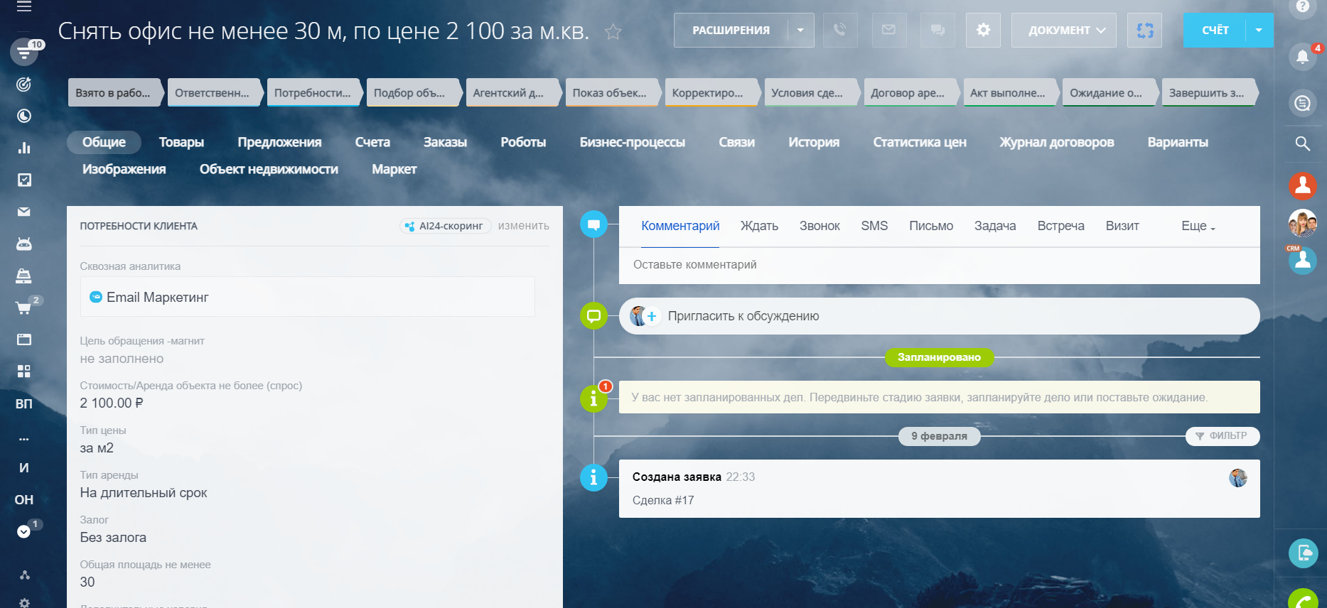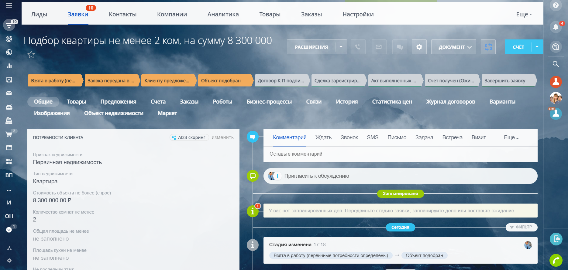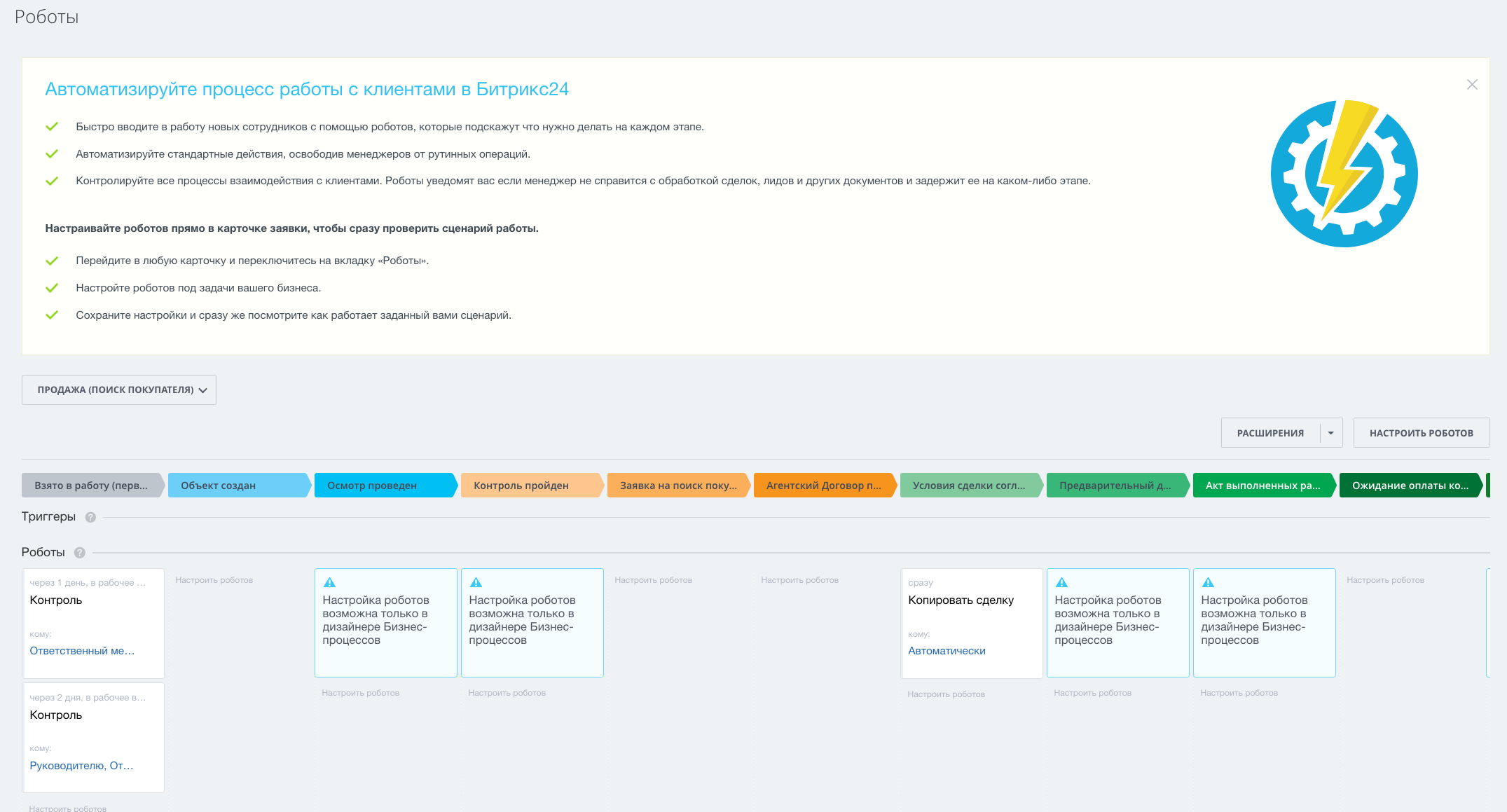 А на тарифах "Стандартный" и "Профессиональный" открываются новые возможности — направление Новостройки, Сдать, Снять, Кредитование, страхование, Переезд в Новый город, Подготовка к проведению сделки, Юр.Услуги, Найм, заполнение обязательных полей от статусов/стадий, а также роботы, которые напоминают сотрудникам о необходимых действиях, сообщают руководителям о забытых сделках и лидах и время реакции на заявку и время обработки заявки.