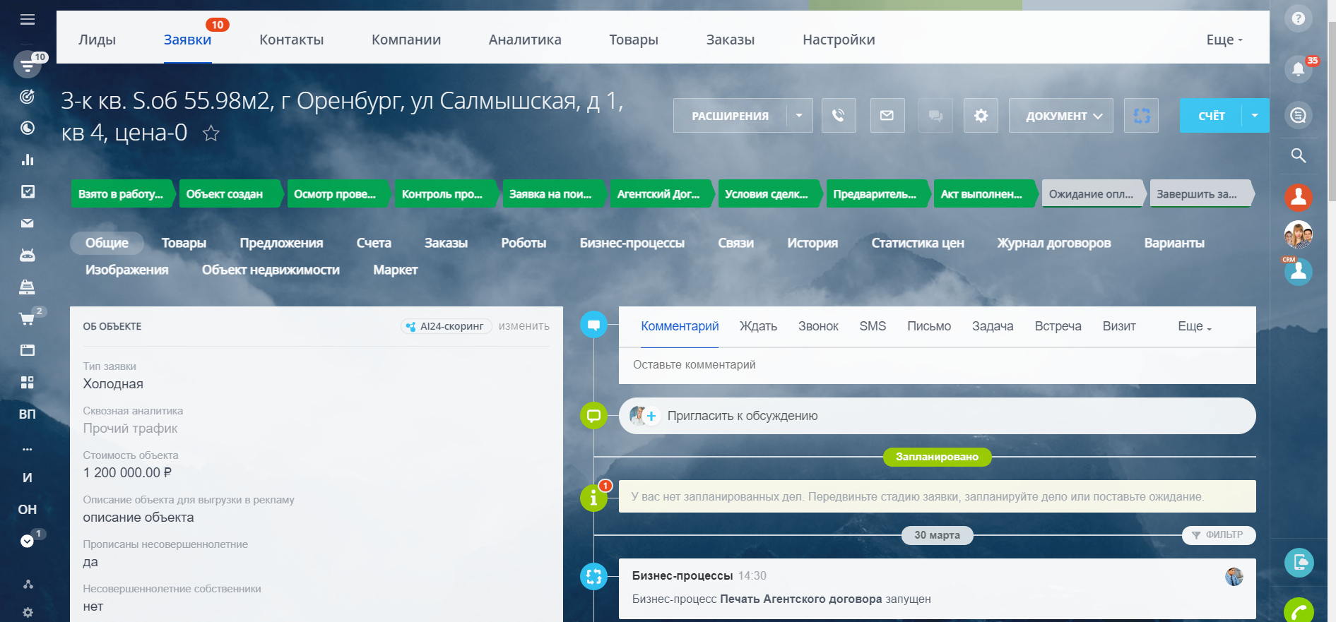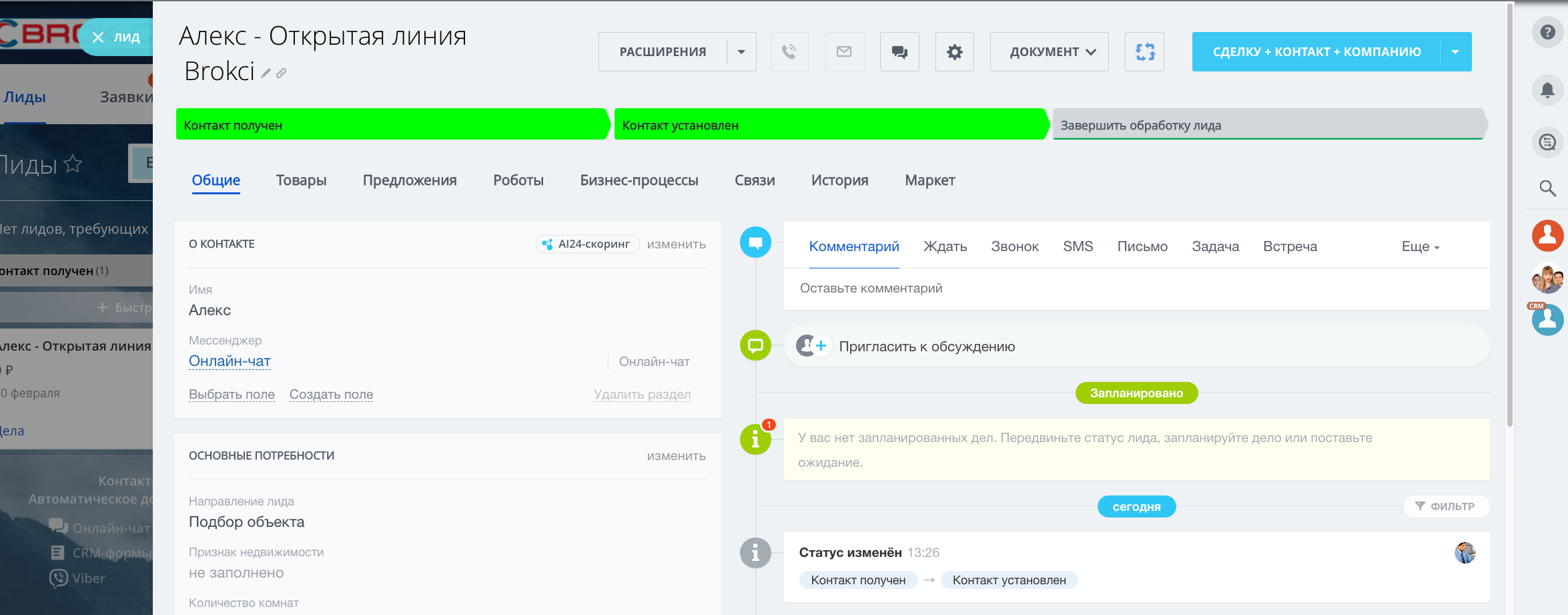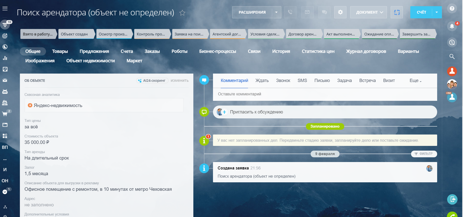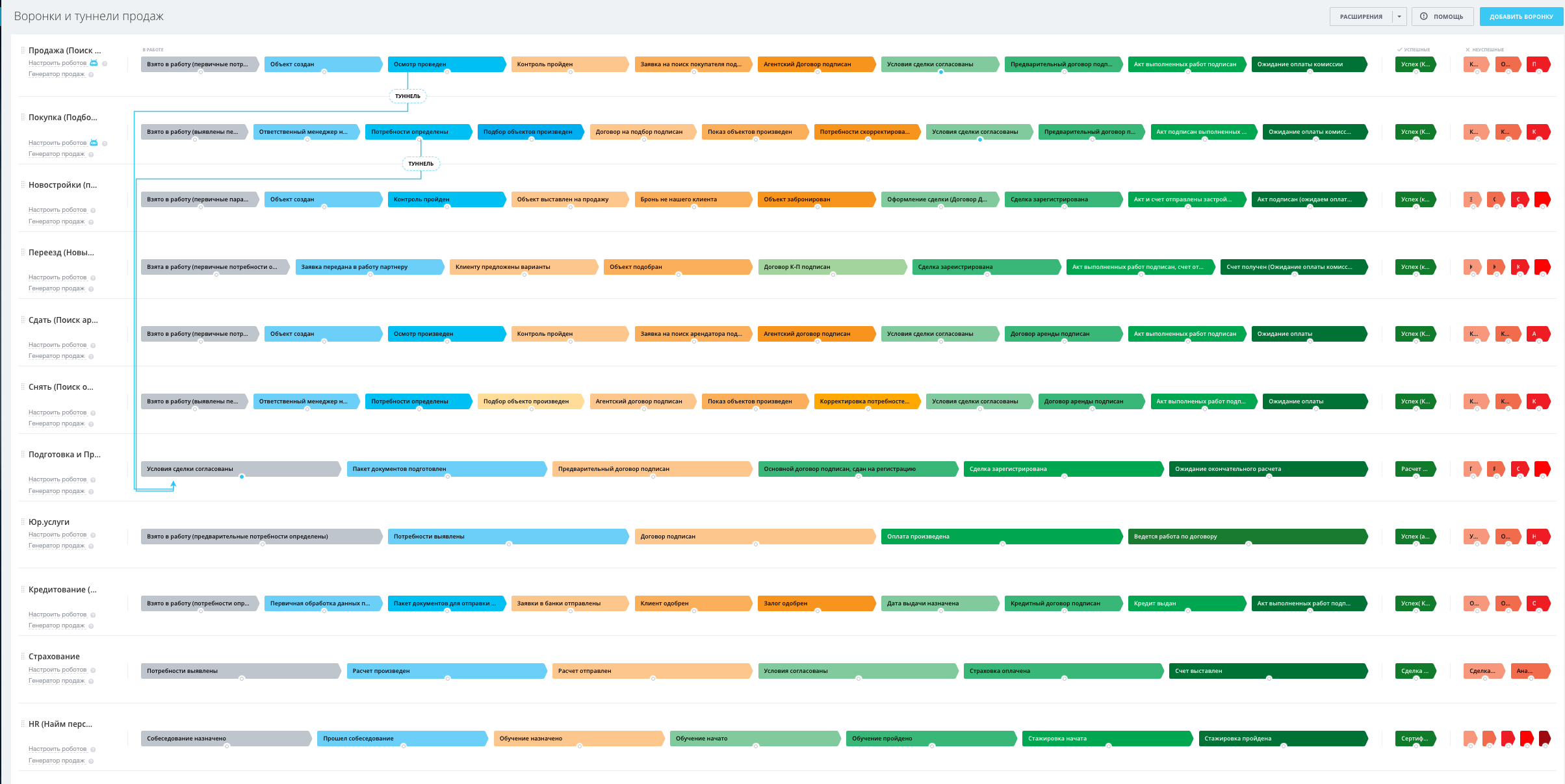 А на тарифах "Стандартный" и "Профессиональный" открываются новые возможности — направление Новостройки, Сдать, Снять, Кредитование, страхование, Переезд в Новый город, Подготовка к проведению сделки, Юр.Услуги, Найм, заполнение обязательных полей от статусов/стадий, а также роботы, которые напоминают сотрудникам о необходимых действиях, сообщают руководителям о забытых сделках и лидах и время реакции на заявку и время обработки заявки.
